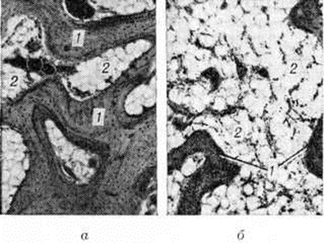 Развитие деоссификации при Остеопороз обусловлено снижением костеобразования и усилением резорбции кости (смотри полный свод знаний), что приводит к расширению каналов остеонов (гаверсовых каналов). В результате Остеопороз корковое вещество кости утрачивает компактное строение, спонгизируется (рисунок 1). Костные перекладины губчатого вещества истончаются, часть их рассасывается полностью, что приводит к расширению пространств между ними (рисунок 2). Разрежение губчатого вещества с уменьшением общего числа костных перекладин и количества минеральных веществ в единице объёма кости нередко сочетается с одновременным утолщением и огрубением сохранившихся костных перекладин. Такая перестройка особенно часто встречается при анкилозе сустава.