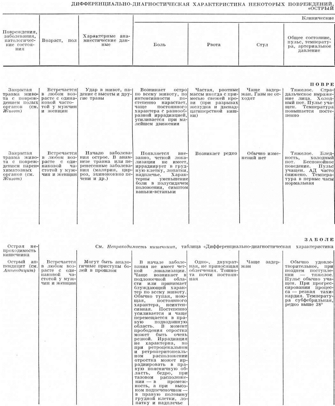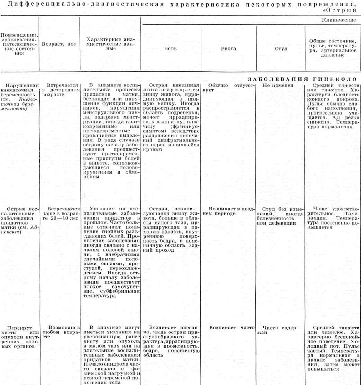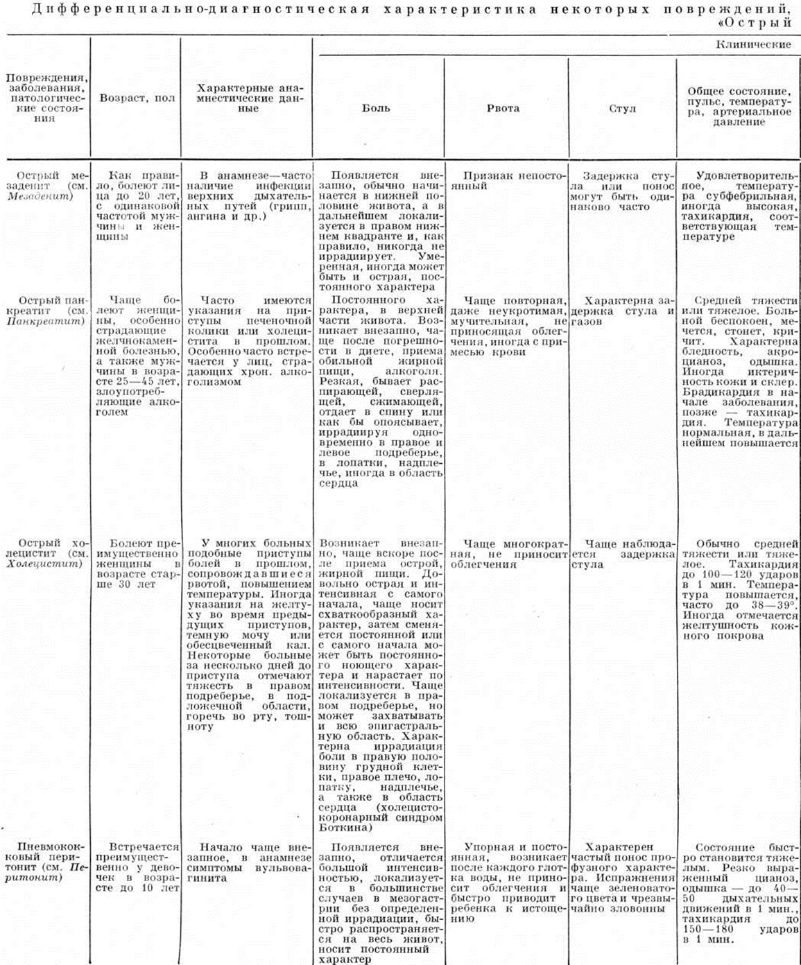 Симптоматика и диагностические мероприятия. Ведущим симптомом практически во всех случаях Острый живот является боль, локализованная или по всему животу. Чёткой зависимости между динамикой заболевания, характером и интенсивностью боли, а также её локализацией обычно не наблюдается. При обширных и тяжёлых поражениях, обусловивших возникновение Острый живот (например, при некоторых видах механической непроходимости кишечника, распространённом геморрагическом панкреонекрозе), болевой синдром может быть резко выраженным и сопровождаться развитием шока (смотри полный свод знаний). Частый симптом Острый живот— рвота, которая может возникать в первые часы и даже минуты заболевания. Рвотные массы обычно состоят из остатков съеденной пищи, желудочного сока, желчи. Рвота, возникшая в более поздние сроки заболевания, как правило, бывает с примесью застойного содержимого, а в поздних стадиях заболевания принимает каловый характер. При желудочном кровотечении рвотные массы обычно имеют вид кофейной гущи или содержат алую кровь. Иногда наблюдается упорная мучительная икота, что обычно связано с раздражением диафрагмального нерва. Так называемый френикус-симптом (смотри полный свод знаний) обычно возникает вследствие раздражения воспалительным экссудатом, излившимся содержимым желудочно-кишечные тракта или кровью нервных окончаний на брюшине, покрывающей диафрагму. Такое же происхождение, очевидно, имеет и так называемый симптом ваньки-встаньки, при котором боли в животе резко усиливаются при попытке больного принять горизонтальное положение, в связи с чем он стремится сесть. Как правило, при Острый живот развиваются нарушения пассажа содержимого кишечника. Задержка стула и газов обычно связана с наличием механической или динамической непроходимости кишечника. Реже бывает жидкий стул (например, при инвагинации кишки). Важным симптомом Острый живот является изменение характера кала. Так, мелена (смотри полный свод знаний) характерна для желудочно-кишечные кровотечений, а примесь алой крови часто наблюдается при инвагинации кишки и острых нарушениях мезентериального кровообращения. Из диагностических мероприятий существенную роль играют изучение анамнеза заболевания и его осложнений, которые могут привести к возникновению симптомов Острый живот, а также сведения о наличии в прошлом приступов болей в животе, о характере и результатах проведённых в прошлом диагностических и лечебных мероприятий. Важные данные можно получить при осмотре больного и наблюдении за его поведением. Так, при повреждении органов брюшной полости, перитоните, внутреннем кровотечении характерно неподвижное положение в определённой позе (часто на боку с приведёнными к животу ногами), поскольку малейшее движение вызывает резкое усиление болей. При ряде патологический процессов, сопровождающихся периодическими схваткообразными болями в животе (например, при печёночной или почечной колике, некоторых формах непроходимости кишечника), больной может быть возбуждён, стонет, кричит, мечется. Часто характерно страдальческое выражение лица, а при разлитом перитоните, странгуляционной непроходимости кишечника — так называемый лицо Гиппократа (смотри полный свод знаний: Гиппократа лицо). При осмотре больного обращают внимание на форму живота