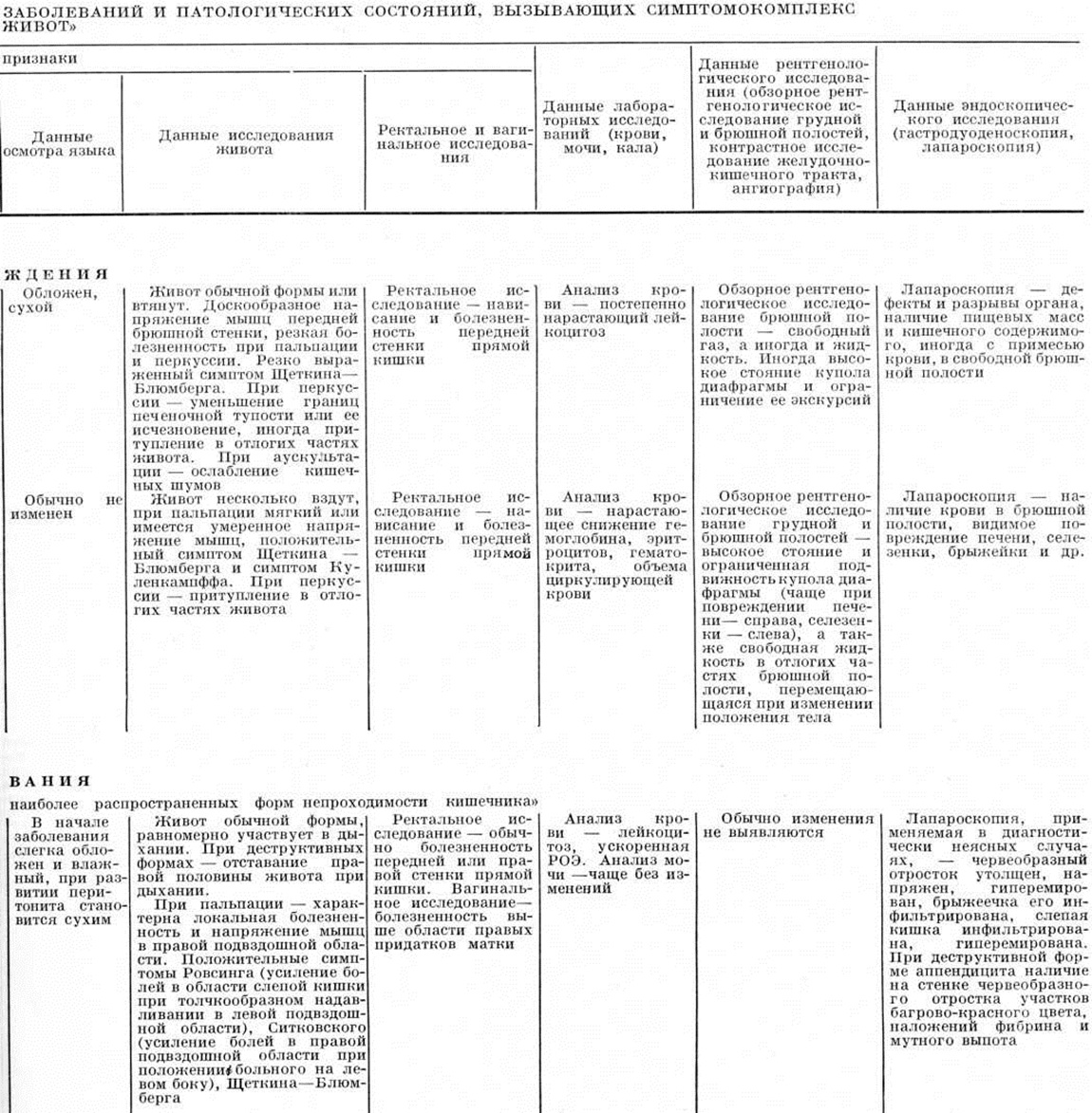 Перкуссия брюшной стенки позволяет обнаружить уменьшение границ или исчезновение печёночной тупости, что характерно для перфорации полого органа, а также наличие свободной жидкости в брюшной полости, наблюдаемое обычно при кровотечении, опухолях органов брюшной полости (карциноматоз брюшины), циррозе печени (асцит); выраженный тимпанит, обусловленный скоплением газов в кишечнике. Аускультация брюшной полости даёт возможность оценить характер перистальтики кишечника (по отсутствию кишечных шумов или их усилению), что позволяет заподозрить непроходимость кишечника. Ректальное исследование помогает обнаружить ряд заболеваний дистального отдела прямой кишки, патологический процессы в параректальной клетчатке, выявить симптом Промптова — резкая болезненность при пальпации шейки матки через прямую кишку (при острых воспалительных заболеваниях внутренних половых органов). Резкая болезненность передней стенки прямой кишки при ректальном исследовании свидетельствует о скоплении воспалительного выпота в полости малого таза. Снижение тонуса сфинктера заднего прохода и расширение ампулы прямой кишки (симптом Обуховской больницы)— характерный признак непроходимости кишечника. Влагалищное исследование, в том числе и инструментальное, позволяет оценить состояние внутренних половых органов и провести дифференциальный диагноз с острыми заболеваниями других органов брюшной полости. Лабораторные исследования помогают уточнить характер изменений, происходящих в организме, и оценить тяжесть состояния больного. Так, при анализе крови можно обнаружить высокий лейкоцитоз со сдвигом формулы влево (при воспалительных заболеваниях), снижение гемоглобина, количества эритроцитов, гематокрита (при внутренних кровотечениях) и так далее При тяжёлом состоянии больного, обусловленном желудочно-кишечные кровотечением или воспалительным процессом, применяют дополнительные методы исследования, например, определение центрального венозного давления, объёма циркулирующей крови, показателей кислотно-щелочного равновесия, водноэлектролитного баланса и так далее Рентгенологические исследование проводят по определённой методике: обзорная рентгеноскопия грудной и брюшной полостей, рентгенография брюшной полости в вертикальном, горизонтальном положении больного и латеропозиции (смотри полный свод знаний: Полипозиционное исследование). При тяжёлом состоянии больного исследование начинают с обзорных рентгенограмм грудной и брюшной полостей в горизонтальном положении больного на трохоскопе и в латеропозиции, причём необходимо достигать изображения обеих половин диафрагмы, боковых каналов брюшной полости и области малого таза. При рентгенологическое исследовании грудной полости изучают состояние лёгких, положение диафрагмы и степень её подвижности при дыхании. При ряде острых заболеваний органов брюшной полости (остром холецистите, остром панкреатите, перитоните) нередко появляются дисковидные ателектазы в базальных отделах лёгких и реактивный плеврит, обычно на стороне, соответствующей локализации поражённого органа. Только при разлитом перитоните, поздних стадиях механической непроходимости кишечника преобладают двусторонние изменения. На обзорных рентгенограммах брюшной полости, произведённых в вертика
