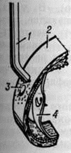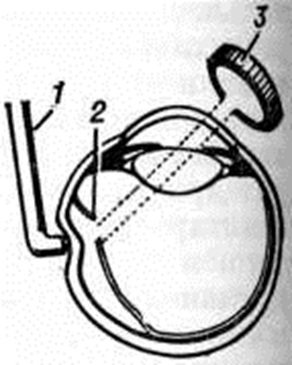 Уровень отслоения сетчатки почти всегда зависит от локализации разрыва. Конфигурация отслоённой сетчатки, разрывы и другие изменения глазного дна наносятся на специальную схему. Существует международный цветовой код для зарисовки состояния глазного дна. Все шире применяется прямой способ установления локализации разрыва сетчатки во время операции путём вдавливания оболочек глаза против разрыва изогнутым пинцетом или толстой инъекционной иглой с затупленным концом и одновременного наблюдения места локальной компрессии с помощью электрического прямого офтальмоскопа или непрямого бинокулярного офтальмоскопа Скепенса (рисунок 1). Периметрический способ расчёта проекции разрывов сетчатки на склеру, описанный во многих руководствах, трудоёмок и недостаточно точен. Устранение Отслойка сетчатки достигается путём вызывания слипчивого воспаления вокруг разрыва и сближения отслоённой сетчатки с сосудистой оболочкой. Из многочисленных способов вызывания слипчивого воспаления наиболее употребительны диатермокоагуляция, криопексия (смотри полный свод знаний: Криохирургия, в офтальмологии), фотокоагуляция (смотри полный свод знаний: Фотокоагуляция глаза) и лазеркоагуляция (смотри полный свод знаний: Лазер, в офтальмологии). Диатермокоагуляция в классическом виде (термокаутеризация по Гонену) представляет своеобразную электросварку сетчатки с сосудистой оболочкой через склеру током высокой частоты (рисунок 2). В месте разрыва производят сквозное прижигание игольчатым электродом. Через возникшее при этом микроотверстие вытекает субретинальная жидкость, сетчатка прилегает к сосудистой оболочке и фиксируется в результате развития слипчивого воспаления, а затем образовавшимся рубцом. В современной офтальмологический практике используют более щадящий метод — криопексию специальными наконечниками, охлаждёнными углекислотой или жидким азотом. Субретинальная жидкость при этом, как правило, не выпускается. Контроль за степенью примораживания проводят офтальмоскопически по образованию белого очажка. Фотокоагуляцию и лазерную коагуляцию как самостоятельные методы лечения применяют при периферических и центральных разрывах сетчатки с плоской её отслойкой. Разрыв отграничивается одним или двумя рядами коагулянтов. Достаточность дозировки определяется по возникновению беловатого ватообразного очажка без кровоизлияний (рисунок 3).