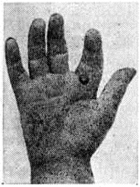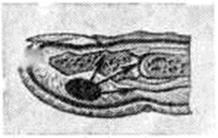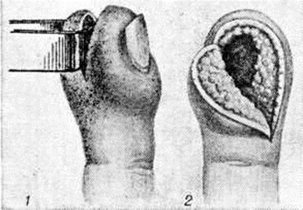 Костным Панариций называется гнойное воспаление пальца с вовлечением в процесс костной ткани (рисунок 1, 5). Различают костный Панариций дистальной, средней и проксимальной фаланг. Костный Панариций может быть первичным, возникающим в результате глубоких колотых ран и заноса инфекции в кость ранящим предметом. Эта форма встречается редко. Преобладает вторичный костный Панариций, причина которого — переход воспаления с мягких тканей на кость. Некроз и гнойное расплавление обусловливают возникновение дефекта кости или образование секвестров. Клинические, картина костного Панариций в ранней стадии не отличается от таковой при подкожном Панариций Вскоре все симптомы становятся резко выраженными. При поражении дистальной фаланги палец приобретает колбообразную форму с напряжённой, блестящей, гладкой кожей. Боль носит постоянный характер. Появляется озноб, головная боль, температура повышается до 39° и выше. В гнойный процесс могут вовлекаться сухожилия, суставы. Суставной Панариций характеризуется гнойным воспалением межфаланговых или пястно-фаланговых суставов (рисунок 1, 6). Различают две стадии течения суставного Панариций В I стадии в процесс вовлекаются только мягкие ткани сустава: появляется гиперемия кожи, отёк, сглаженность межфаланговых складок; палец приобретает веретенообразную форму. Толчкообразное давление по продольной оси пальца резко усиливает постоянную боль. При пункции сустава (смотри полный свод знаний: Суставы) можно получить мутную жидкость. Во II стадии разрушаются суставные хрящи, боковые связки, наступает деструкция костей, образующих сустав. Возникает патологический подвижность, вплоть до подвывиха в суставе, определяется крепитация суставных поверхностей. Может произойти самопроизвольное вскрытие такого Панариций, при этом образуется свищ с грануляциями и гнойным отделяемым. Сухожильный Панариций— гнойное воспаление влагалища сухожилия и сухожилия пальца (рисунок 1, 7). Воспаления сухожилий разгибателей пальцев, как правило, не бывает. Сухожилия сгибателей пальцев обычно вовлекаются в процесс вторично, воспаление переходит на них с влагалища сухожилий. Сдавление тонких сосудов, подходящих к сухожилию через мезотендиний, быстро накапливающимся во влагалище сухожилия экссудатом и тромбоз их приводят в короткие сроки к некрозу сухожилия. Гной из влагалища может прорваться наружу с образованием свища (рисунок 4). При сухожильном панариции I пальца гной может распространяться по влагалищу сухожилия длинного сгибателя большого пальца кисти в общее синовиальное влагалище сгибателей и к V пальцу. Возникает так называемый перекрёстный панариций. Возможно распространение гнойного процесса и в обратном направлении — от V пальца к I. Иногда процесс может перейти на глубокие слои предплечья — в так называемый пространство Пирогова—Парона. Этого не наблюдается при сухожильном панариции II, III и IV пальцев, влагалища сухожилий которых изолированы от общего синовиального влагалища сгибателей кисти. Основной признак сухожильного Панариций—постоянная боль по ходу сухожилия, усиливающаяся при попытке разгибания пальца. Несвоевременное хирургическое вмешательство влечёт за собой некроз сухожилия на большом протяжении, отторжение которого происходит очень медленно. Нежизнеспособное сухо