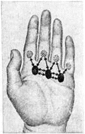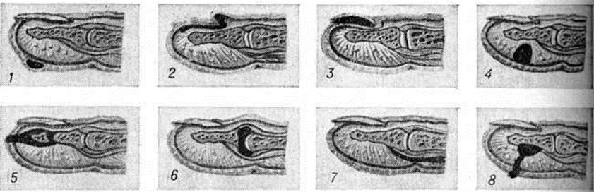 Пузырь окружён узким воспалительным валиком. Боль вначале незначительная, но по мере накопления гноя усиливается, становится постоянной, пульсирующей. Иногда очаг гиперемии вокруг пузыря расширяется, присоединяется лимфангиит (смотри полный свод знаний) и регионарный лимфаденит (смотри полный свод знаний), сопровождающийся повышением температуры тела до высоких цифр. Ранее подобное поражение называли лимфатическим панарицием. В современной хирургической литературе этот термин практически не употребляется. При кожном Панариций гнойный очаг в толще кожи может сообщаться с очагом в подкожной клетчатке — так называемый панариций в форме запонки (рисунок 1, 8). При околоногтевом Панариций— паронихии (смотри полный свод знаний) гнойное воспаление локализуется в толще валика ногтя: в боковом его участке, над корнем ногтя, или на всем протяжении валика (рисунок 1, 2). Кожа валика краснеет, припухает (цветной рисунок 1), из-под валика при надавливании появляются капли гноя. Подногтевой Панариций характеризуется скоплением гноя под телом ногтя (рисунок 1,5). Он возникает при инфицировании проникающих под ноготь колотых ран, нагноении подногтевых гематом или как осложнение паронихии; протекает остро. Ноготь приподнят, сквозь него просвечивает гной. Ограничение гнойного очага плотной ногтевой пластинкой обусловливает постоянную резко выраженную пульсирующую боль. Подкожный Панариций— воспаление подкожной клетчатки пальца (рисунок 1, 4) — наиболее распространённая форма Панариций Чаще встречается подкожный Панариций ладонной поверхности дистальных фаланг. Так как на тыльной поверхности пальцев кожа подвижная, а подкожная клетчатка рыхлая и содержит много лимфатических, сосудов, широко анастомозирующих с лимфатических, сосудами ладонной поверхности, то при расположении гнойного очага на ладонной поверхности пальца отёк, припухлость и гиперемия кожи более чётко выражены на боковых поверхностях и тыле пальца. Палец (или фаланга) увеличивается в объёме, становится напряжённым (цветной рисунок 2, 3). Большая толщина, плотность и неподатливость кожи ладонной поверхности, ячеистое расположение подкожной клетчатки способствуют быстрому распространению воспалительного процесса в сторону надкостницы и сухожилий. Боль постоянная, усиливается при разгибании и ослабевает при умеренном сгибании пальца. Точка наибольшей болезненности соответствует локализации центра гнойного очага. Часто больной лишается сна из-за боли, изнурён, температура тела повышается до 38—39°. В гнойное воспаление могут вовлекаться кость, сухожилия, суставы (рисунок 2). Из очага, локализующегося в проксимальной фаланге пальца, гнойный процесс может перейти по рыхлой клетчатке межпальцевых промежутков в каналы червеобразных мышц, дистальный отдел ладони и на проксимальные фаланги соседних пальцев (рисунок 3).