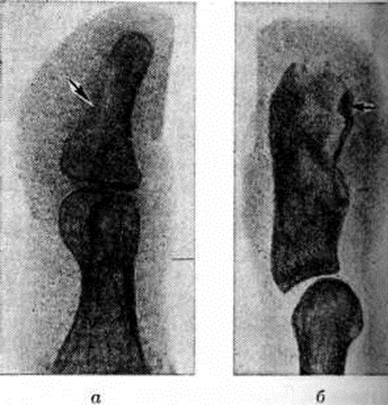 При костном панариции уже к концу 1-й недели болезни на рентгенограммах отмечается неравномерное просветление — реактивный остеопороз поражённой части фаланги вплоть до почти полного исчезновения структуры этой части фаланги при дальнейшем развитии Панариций (рисунок 6, а). По затихании воспаления очертания и структура фаланги восстанавливаются через 3—5 недель Ошибочное толкование этого просветления фаланги как некроза может привести к неоправданной резекции или даже экзартикуляции жизнеспособной фаланги. В отличие от описанной картины некротизированная часть фаланги, лишённая кровоснабжения, сохраняет на рентгенограммах тень нормальной интенсивности; образовавшийся секвестр часто смещается (рисунок 6, б). При интактности смежного сустава суставная щель и Подхрящевые корковые слои сохраняются. При осложнении костного Панариций гнойным артритом на рентгенограммах помимо остеопороза наблюдается прогрессирующее сужение суставной полости (вследствие хондролиза суставных хрящей), неровность и нечёткость контуров суставных концов (рисунок 7, а). Иногда гнойный артрит может осложниться дистензионным вывихом или подвывихом фаланги (рисунок 7, б). Суставной Панариций ведёт к анкилозу; при этом на рентгенограмме исчезают корковые слои суставных концов и суставная полость, на месте которой костно-трабекулярная структура переходит из одной кости в другую. При активно и длительно текущем костном или суставном Панариций может наблюдаться просветление всех смежных костей кисти (главным образом суставных концов костей), то есть регионарный остеопороз. При костном Панариций дистальной фаланги на рентгенограммах отсутствует оссифицирующий периостит вследствие малой активности здесь камбиального, остеогенного слоя надкостницы. Дифференциальная диагностика различных форм Панариций основывается на особенностях клинические, проявлений. Диагностика таких заболеваний пальцев, как фурункул (смотри полный свод знаний), карбункул (смотри полный свод знаний), обычно не сложна. Поражение пальцев возможно при туберкулёзе, актиномикозе, туляремии и др. Уточнение диагноза в таких случаях иногда представляет известные трудности и требует специальных бактериологических и серологических исследований, проводимых при соответствующих заболеваниях (смотри полный свод знаний: Актиномикоз, Гонорея, Сифилис, Туляремия и др.). Лечение. Основной метод лечения Панариций— оперативный. Консервативная терапия может быть эффективной лишь в начальной (серозно-инфильтративной) стадии. Однако комплекс консервативных мероприятий играет важную роль как дополнение к операции. Большое значение при этом имеет предоставление покоя поражённому пальцу и всей кисти, который достигается наложением гипсовой лонгеты на кисть и предплечье в функционально выгодном положении (смотри полный свод знаний: Гипсовая техника). Применяют горячие ванны для кисти и дистальной части предплечья, УВЧ-терапию, электрофорез с трипсином и другими ферментами, диадинамические токи, ультразвук, рентгенотерапию, иногда прибегают к местной гипотермии. По стихании острых явлений после операции применяют комплекс упражнений ЛФК. Особенно существенным компонентом комплексного лечения Панариций является антибактериальная терапия, мощным средством которой служат а