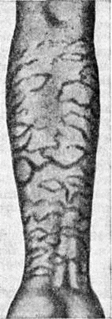 Выделяют Параонкологические дерматозы облигатные, факультативные и вероятные. К облигатным Параонкологические дерматозы, особенно часто сопутствующим раку внутренних органов, относят acanthosis nigricans (смотри полный свод знаний), круговидную внезапно возникающую эритему, описанную Гаммелом (J. A. Gammel, 1952) у больных раком молочной железы. Клинически заболевание характеризуется быстро возникающими зудящими полосовидными гирляндоподобными эритематозными высыпаниями (рис.) с умеренным мелкопластинчатым шелушением, имеющими тенденцию к генерализации и быстрой смене очертаний эритемы; возникает чаще у лиц в возрасте 45—75 лет, страдающих в большинстве случаев раком верхних дыхательных путей, молочной железы, половых органов, предстательной железы, желудка.