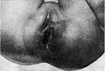 К факторам, способствующим развитию Парапроктит у детей, относятся запоры, поносы, травмирование слизистой оболочки прямой кишки и заднего прохода инородными телами, мацерация кожи промежности, воспаление слизистой оболочки прямой кишки на фоне энтеровирусной инфекции; несколько реже развитию Парапроктит способствуют дивертикулы прямой кишки, кальциноз, глистная инвазия, операции на промежности и органах таза. Возбудителем является кишечная палочка как моноинфекция и в сочетании со стафилококком и тетракокком. Наиболее часто у детей встречается подкожная форма острого Парапроктит, реже — подкожно-подслизистая, подслизистая, седалищно и тазовопрямокишечная; изредка возможно тотальное поражение околопрямокишечной клетчатки анаэробной инфекцией. Клинические, картина острого Парапроктит зависит от распространённости процесса и стадии его течения. У новорожденных и детей первого года жизни на первый план выступают общие симптомы: беспокойство при изменении положения и пеленании, отхождении газов и акте дефекации, повышение температуры до 38°, отказ от еды. К концу первых суток появляются местные симптомы. При подкожной форме определяется инфильтрат, локализующийся рядом с прямой кишкой (рисунок 8). Подслизистый инфильтрат определяется при ректальном исследовании; на 2—3-и сутки обычно появляется гноетечение из заднего прохода. При седалищно-прямокишечной форме путём ректального исследования выявляют инфильтрат, который не имеет чётких границ, верхний полюс его достигается с трудом. Ранним признаком данной формы являются остро возникшие общие симптомы, а со вторых суток — обильное отделение слизи из заднего прохода. При тазово-прямокишечной форме инфильтрат можно определить путём бимануального исследования через прямую кишку и переднюю брюшную стенку. Анаэробный Парапроктит характеризуется гангренозно-гнилостным процессом, приводящим к обширным разрушениям клетчатки промежности и околопрямокишечного пространства, стенки прямой кишки, влагалища (рисунок 9). Осложнением острого Парапроктит является формирование прямокишечно-промежностных и прямокишечно-влагалищных свищей, через которые постоянно или периодически выделяются гной, газы, иногда кал. Для детей характерно формирование полных чрессфинктерных, прямокишечных свищей. Диагноз Парапроктит у детей основывается на тех же данных, что и у взрослых. Дифференциальный диагноз проводят с тазовой флегмоной новорожденного, абсцессом ягодицы, тератомами и жировыми придатками промежности, осложнёнными гемангиомой. Дети с Парапроктит подлежат госпитализации в экстренном порядке. Принципы лечения аналогичны описанным у взрослых. При оперативном вмешательстве особое внимание уделяют сохранению волокон сфинктера, что тем важнее, чем младше ребёнок. Прогноз зависит от своевременности диагностики и оперативного лечения. Профилактика включает комплекс мероприятий, направленных на правильный гигиенические режим ребёнка, рациональное вскармливание, предупреждение вирусных и гнойничковых заболеваний.