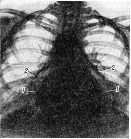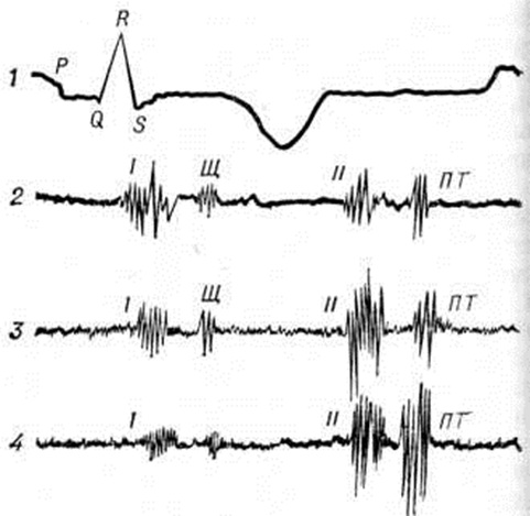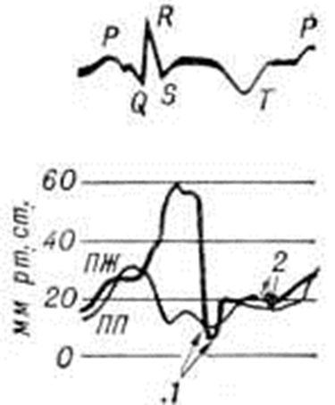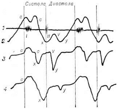 При больших количествах выпота в полости перикарда диагностическое значение приобретают признаки сдавления органов средостения (затруднённое глотание, охриплость голоса) и тампонады сердца (приступы слабости с холодным липким потом, снижение АД, частый малый пульс и другие). Кроме резкого расширения границ сердца, отмечается снижение громкости его тонов, отмечаются видимые гемодинамические нарушения — цианоз лица и шеи, значительная набухлость шейных вен. Специфическое диагностическое значение имеет выявление двойного инспираторного феномена — парадоксального пульса и набухания шейных вен в фазу вдоха. Окончательное подтверждение диагноза экссудативного Перикардит получают при рентгенологическое исследовании (смотри полный свод знаний ниже) или с помощью эхокардиографии (смотри полный свод знаний), а характер экссудата (хилёзный, холестериновый, серозный, гнойный и другие) уточняется после пункции перикарда. Эхокардиография позволяет надёжно обнаружить выпот в перикардиальной полости даже при малых его количествах (50—100 миллилитров) по возникновению эхонегативного пространства между задней стенкой левого желудочка и оттеснённым кзади париетальным листком перикарда. При больших выпотах этим методом выявляется слой жидкости также над передней стенкой правого желудочка—возникает феномен «плавающего сердца». Адгезивный (слипчивый) Перикардит при наличии данных о Перикардит в анамнезе может быть заподозрен в случае стабилизации у больного одышки, при появлении жалоб на сухой кашель, боли в груди, слабость. До проведения рентгенологическое исследования диагноз устанавливается при наличии систолического втяжения верхушечного толчка, протодиастолического тона броска и выявлении диастолического венозного коллапса. О констриктивном Перикардит свидетельствуют выраженная одышка без ортопноэ, значительная слабость и утомляемость больных при физической нагрузке, признаки высокой венозной гипертензии с цианозом и отёчностью лица и шеи («воротник Стокса», «консульская голова»), наличие увеличенной печени и асцита при отсутствии, как правило, отёков на ногах. Верхушечный толчок сердца обычно не определяется; при аускультации сердца часто обнаруживается протодиастолический тон броска, иногда добавочный пресистолический тон. Изменяются кривые давления в правых камерах сердца (рисунок 2). В период расслабления давление в правом желудочке резко снижается, что отражается на кривых давления протодиастолическим «провалом»; в фазу быстрого наполнения оно повышается, достигая уровня центрального венозного. При этом на кривых давления формируется так называемый теледиастолическое плато. На кривой пульса яремной вены (рисунок 3) нередко регистрируется характерная двухволновая кривая, представленная положительными волнами а и v, вершины которых уплощены, как бы срезаны, и крутыми спадами. Волна с, отражающая сокращение правого желудочка, уменьшается. Различия в степени уменьшения объёма правого желудочка и переполнения вен обусловливают весьма вариабельные формы кривой венного пульса, что ограничивает её диагностическое значение. Электрокардиографическое исследование занимает одно из важнейших мест в диагностике острого сухого Перикардит Наиболее ранним признаком острого Перикардит на ЭКГ (рисунок 4