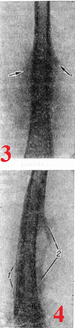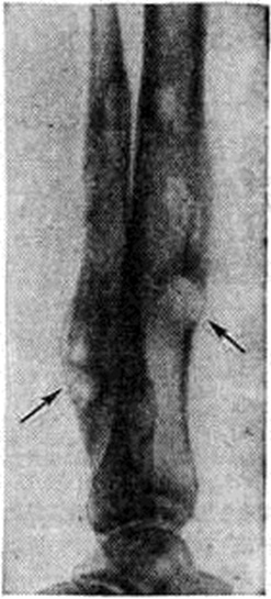 Периостит при других заболеваниях. При оспе описан Периостит диафизов длинных трубчатых костей с соответствующими утолщениями их, причём это явление наблюдается обычно в период реконвалесценции. При сапе отмечаются очаги ограниченного хронический воспаления надкостницы. При лепре описаны инфильтраты в надкостнице; кроме того, у лепрозных больных на трубчатых костях вследствие хронический Периостит могут образоваться веретенообразные вздутия. При гонорее наблюдаются воспалительные инфильтраты в надкостнице, при прогрессировании процесса — с гнойным отделяемым. Выраженный Периостит описан при бластомикозах длинных трубчатых костей, возможны заболевания рёбер после сыпного тифа в виде ограниченных плотных утолщений периоста с гладкими контурами. Локальный Периостит встречается при варикозном расширении глубоких вен голени, при варикозных язвах. Ревматические гранулемы костей могут сопровождаться Периостит Чаще всего процесс локализуется в малых трубчатых костях — пястных и плюсневых, а также в основных фалангах; ревматические Периостит склонны к рецидивам. Иногда при заболевании кроветворных органов, особенно при лейкемии, отмечают незначительный по размерам Периостит При болезни Гоше (смотри полный свод знаний Гоше болезнь) описаны периостальные утолщения преимущественно вокруг дистальной половины бедра. При длительной ходьбе и беге может возникать Периостит большеберцовой кости. Для этого Периостит характерны жестокие боли, особенно в дистальных частях голени, усиливающиеся при ходьбе и упражнениях и стихающие в покое. Местно видна ограниченная припухлость в связи с отёчностью надкостницы, очень болезненная при пальпации. Описан Периостит при актиномикозе. Рентгенодиагностика. Рентгенологические исследование выявляет локализацию, распространённость, форму, размеры, характер структуры, очертания периостальных наслоений, их взаимоотношения с корковым слоем кости и окружающими тканями. Рентгенологически различают линейные, бахромчатые, гребневидные, кружевные, слоистые, игольчатые и другого вида периостальные наслоения. Хронические, медленно текущие процессы в кости, особенно воспалительные, обычно вызывают более массивные напластования, как правило, сливающиеся с основной костью, что ведёт к утолщению кортикального слоя и увеличению объёма кости (рисунок 1). Быстро протекающие процессы ведут к отслоению надкостницы гноем, распространяющимся между ней и кортикальным слоем, воспалительным или опухолевым инфильтратом. Это можно наблюдать при остром остеомиелите, опухоли Юинга (смотри полный свод знаний Юинга опухоль), ретикулосаркоме (смотри полный свод знаний). Видимая в этих случаях на рентгенограмме линейная полоска новой кости, образованная надкостницей, оказывается отделённой от кортикального слоя полосой просветления (рисунок 2). При неравномерном развитии процесса таких полосок новой кости может быть несколько, в результате чего образуется картина так называемый слоистых («луковичных») периостальных напластований (рисунок 3). Гладкие, ровные периостальные наслоения сопровождают поперечную патологическую функциональный перестройку. При остром воспалительном процессе, когда под периостом скапливается гной под большим давлением, надкостница может разрываться, и на участках 