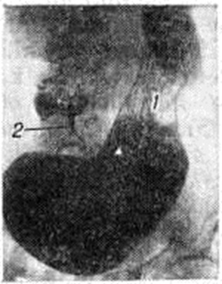 В мышечных слоях отмечается очаговая или диффузная гипертрофия мышечных волокон с увеличением размеров их ядер и вакуолизацией цитоплазмы (рисунок 1, в) в сочетании с гиперплазией эластических волокон вокруг них. Число ганглиозных клеток в нервных сплетениях желудка уменьшено, в ядрах их наблюдается дистрофия. Клиническая картина. Выделяют три фазы развития приобретённого Пилоростеноз: компенсации, субкомпенсации и декомпенсации. В фазе компенсации Пилоростеноз отмечаются жалобы на чувство полноты в эпигастрии после еды, периодическую рвоту. В фазе субкомпенсации наблюдается постоянное чувство тяжести в эпигастрии, отрыжка «тухлым», обильная рвота, видимая на глаз перистальтика. Натощак из желудка откачивается большое количество содержимого с примесью накануне съеденной пищи с признаками гнилостного брожения. Для фазы декомпенсации характерны тяжёлые нарушения общего состояния, большая потеря веса, обезвоживание организма (смотри полный свод знаний), гипопротеинемия, гипокалиемия (смотри полный свод знаний), азотемия (смотри полный свод знаний), алкалоз (смотри полный свод знаний). В далеко зашедших случаях вследствие прогрессирования нарушений водноэлектролитного баланса, резко выраженной гипохлоремии (смотри полный свод знаний) и гипокальциемии (смотри полный свод знаний Тетания) развивается судорожный синдром (так называемый желудочная тетания). Рвота при этом может отсутствовать. Видны контуры переполненного желудка, постоянно определяется шум плеска. При зондировании удаляется большое количество гниющих пищевых масс. Диагноз устанавливают на основании характерного симптомокомплекса, результатов зондирования желудка, гастроскопии, рентгенологическое данных и изучения моторной функции желудка. Важную роль в диагностике Пилоростеноз играет гастроскопия (смотри полный свод знаний), с помощью которой можно определить причину заболевания (язва, опухоль, рубец), а также точно установить диаметр суженного привратника. Задача рентгенологическое исследования сводится к обнаружению Пилоростеноз, уточнению его происхождения и оценке степени компенсации стеноза. Для более плотного заполнения пилорического отдела контрастной массой необходимо прибегать к полипозиционному исследованию, в частности к латероскопии (смотри полный свод знаний Полипозиционное исследование). Облегчает диагностику и двойное контрастирование желудка — барием и воздухом. В целях дифференцирования органического сужения привратника и пилороспазма (смотри полный свод знаний) используют фармакологических пробы. Сужение, вызванное злокачественной опухолью, имеет ригидный характер, контуры его неровные с дефектами наполнения. При Пилоростеноз другой этиологии контуры сужения гладкие, наблюдается изменчивость суженного участка на серийных снимках. В фазе компенсации Пилоростеноз желудок нормальных размеров или несколько увеличен, эвакуация не задержана или длится 8—12 часов, перистальтика его глубокая, усиленная. В фазе субкомпенсации желудок увеличен в размерах, натощак содержит жидкость, перистальтика ослаблена, опорожнение задерживается до 24 часов Декомпенсация проявляется расширением желудка, который содержит много жидкости, слизи, остатков пищи, гипотоничен, вследствие чего контрастная масса опускается на дно ж