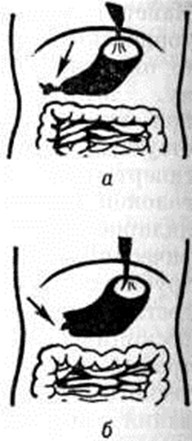Лечение — оперативное. Важное значение имеет предоперационная подготовка, которую в тяжёлых случаях проводят в палате интенсивной терапии или реанимационном отделении. Она должна быть направлена на восстановление тонуса желудка (регулярные промывания желудка), а также нормализацию водно-электролитного баланса, кислотнощелочного равновесия, белкового обмена (внутривенное введение хлорида калия, хлорида натрия, хлорида кальция, 10% раствора глюкозы, белковых гидролизатов, крови и другие). При злокачественной опухоли выходного отдела желудка производят субтотальную резекцию желудка (смотри полный свод знаний Желудок, операции). При доброкачественной опухоли, осложнённой стенозом привратника, показана экономная резекция желудка. При тяжёлом общем состоянии больного, неоперабельной опухоли ограничиваются наложением гастроэнтероанастомоза (смотри полный свод знаний Гастроэнтеростомия). При язвенной болезни, осложнённой Пилоростеноз, производят резекцию желудка, а также ваготомию (смотри полный свод знаний) в сочетании с экономной резекцией желудка, пилоропластикой (смотри полный свод знаний), гастродуодеиостомией (смотри полный свод знаний) или гастроэнтероанастомозом . Прогноз при неопухолевом процессе благоприятный. Профилактика приобретённого Пилоростеноз сводится к своевременному лечению основного заболевания. Пилоростеноз у детей. Врождённый Пилоростеноз— порок развития желудочно-кишечные тракта, выявляемый у 5—40 детей на 10 000 родившихся. У мальчиков наблюдается в 5—10 раз чаще, чем у девочек. Этиология и патогенез. Сужение пилорического канала обусловлено избыточным развитием и нарушением структурных взаимоотношений мышечных слоёв и соединительной ткани привратника. Эти изменения по строению весьма близки к структуре избыточной закладки пилорического отдела желудка, что даёт основание считать врождённый Пилоростеноз результатом задержки её обратного развития под влиянием повреждающих факторов (вероятно, гормональных нарушений). После рождения ребёнка возникает застойный гастрит, присоединяется пилороспазм и отёк тканей привратника, что усугубляет сужение пилорического канала и обусловливает проявления заболевания, выраженность и тяжесть которых могут быть различны. Клиническая картин а. Заболевание проявляется на 2—4-й недель жизни срыгиваниями, переходящими в течение нескольких дней в рвоту фонтаном свежим и створоженным молоком без примеси желчи. Частота рвоты колеблется от 2—3 до 10—16 раз в сутки, причём общее состояние длительное время сохраняется удовлетворительным. С развитием расширения и атонии желудка рвота возникает реже, количество рвотных масс превышает объем съеденного молока, в них содержится слизь, из-за наличия в них крови они имеют вид кофейной гущи, появляется неприятный запах. Ограничение поступления молока в кишечник ведёт к снижению веса тела, исхуданию, обезвоживанию, олигурии, ложному запору. При поглаживании подложечной области, особенно после кормления, часто выявляется сегментирующая перистальтика желудка. Нередко можно пальпировать под краем печени плотную сливообразную опухоль — утолщённый привратник. На ранних стадиях Пилоростеноз у детей с лёгкими формами врождённого Пилоростеноз наблюдается незначительный дефицит объёма циркулирующей крови. При 