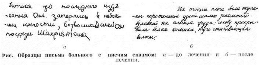Клиническая картина характеризуется появлением при попытке писать резкого тонического напряжения в разных группах мышц руки, участвующих в акте письма. Чаще оно захватывает сгибатели I — III пальцев и пронаторы кисти. Наряду с тоническим напряжением мышц наблюдается дрожание руки, боли и слабость в ней, что резко искажает почерк (рисунок, а, б) и затрудняет акт письма, иногда делает его невозможным. В результате неравномерного распределения тонуса сгибателей и разгибателей кисти может наблюдаться пронаторная или супинаторная установка кисти. При пронаторной установке кисти больной пишет, приподнимая предплечье и отрывая локоть от стола; при супинаторной — кисть находится в состоянии экстензии и супинации, больной приподнимает руку и выдвигает её вперёд. Для больного затруднено ведение пера по строчке, особенно в конце строки, и движение руки по бумаге (акт письма облегчается, если исследующий подтягивает листок бумаги). Нередко больные прибегают к различным компенсаторным приёмам: фиксируют ручку между II —III, III — IV пальцами или зажимают её в кулаке, подталкивают правую руку левой, пишут толстой, тяжёлой ручкой, применяют ручкодержатели, что облегчает письмо. Отмечается тесная зависимость состояния письма от его темпа: убыстрение темпа резко нарушает акт письма. Нарушение письма носит, как правило, изолированный характер при сохранности других двигательных актов, выполняемых рукой (пользование ложкой и вилкой, бритье, застёгивание пуговиц). Письмо стоя, например, мелом на доске, часто не затруднено. При длительном существовании Писчий спазм больным становится трудно выполнять и другие двигательные акты. Нередко при Писчий спазм наблюдаются явления миозита, синовита, тендовагинита на поражённой руке или шейно-плечевого радикулита, обусловленного остеохондрозом.