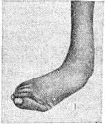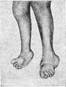 Паралитическое плоскостопие (рисунок 8) образуется при параличе мышц, поддерживающих своды стопы, наиболее часто после полиомиелита (смотри полный свод знаний). В лёгких случаях рекомендуют ортопедические ботинки. При нефиксированной деформации у детей, начиная с 5-летнего возраста, производят пересадку длинной малоберцовой мышцы на внутренний край стопы. Для удержания пятки от вальгусного отклонения показан внесуставной артродез таранно-пяточного сустава по Грайсу (рисунок 9).