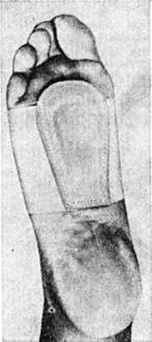 Для улучшения трофики тканей проводят физиотерапевтическое лечение. При выраженном Плоскостопие назначают ортопедические стельки (супинаторы) с выкладкой поперечного или одновременно поперечного и продольного свода. При поперечном Плоскостопие применяют манжеты из бандажной резины с вкладкой для поддержания свода (рисунок 4). При резко выраженном Плоскостопие показана ортопедическая обувь (смотри полный свод знаний).