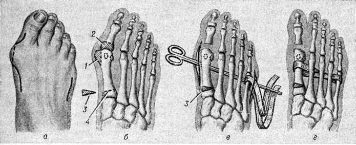 Комплекс оперативных приёмов, направленных на устранение поперечного плоскостопия и деформации I пальца, называют реконструктивной операцией переднего отдела стопы (рисунок 6.). Операцию производят под внутрикостным или общим обезболиванием. После операции накладывают гипсовый сапожок; на 5-й день начинают движения I пальца. Через 2 недель повязку укорачивают и превращают в съёмную. Через 1 месяцев Разрешают ходьбу в манжетах с поддержкой поперечных сводов в обуви со шнуровкой, на каблуке до 3 сантиметров,