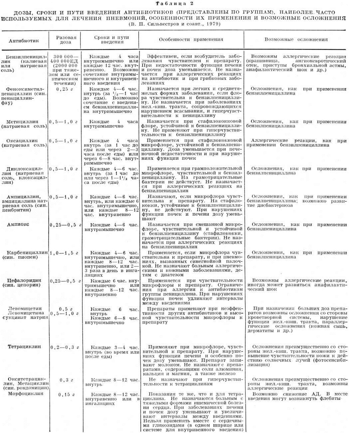 В острую фазу Пневмония рекомендуется назначать одновременно два антибиотика или один антибиотик в сочетании с сульфаниламидным препаратом. Доза и число одновременно назначаемых антибиотиков зависят от тяжести течения и распространённости процесса. В таблице 2 приведены данные о дозах, сроках и путях введения антибиотиков, наиболее часто используемых для лечения пневмоний, особенности их применения и возможные осложнения. С целью профилактики привыкания к антибактериальным средствам и уменьшения опасности аллергических реакций рекомендуется через 7—10 дней препараты менять. Вопрос о длительности антибактериальной терапии должен решаться индивидуально. Больным с крайне тяжёлым течением Пневмония, полисегментарным распространением инфильтрации рекомендуется назначение 2—3 антибактериальных средств в максимальных дозах преимущественно внутривенно. Для достижения длительного и непрерывного воздействия лекарственных средств на воспалительный процесс у больных с затяжным течением острой Пневмония применяется чрескожная катетеризация трахеи и бронхов (смотри полный свод знаний Микротрахеостомия) с введением антибиотиков, муколитических и других средств непосредственно в зону плохо рассасывающегося пневмонического очага. С той же целью можно проводить лечебно-диагностические бронхоскопии, во время которых из бронхов удаляют слизистые и гнойные пробки и промывают их растворами бронхолитических средств, протеолитических ферментов, щелочей, витаминов, гидрокортизона, а в конце процедуры вводят антибактериальные средства. При лечении больных острой Пневмония антибиотики следует сочетать с сульфаниламидными препаратами, назначение которых возможно с самого начала острой Пневмония (таблица 3). На этапе выздоровления антибиотики отменяют, оставляя сульфаниламиды. Одновременно с антибиотиками и сульфаниламидами можно применять фитонцидные препараты (ингаляции р-ров сока чеснока, лука, зверобоя и другие), наиболее целесообразные при стихании острых явлений. На этапе начинающегося выздоровления можно лечить сульфаниламидным препаратом и фитонцидами, а затем, отменив сульфаниламид, заканчивать санацию активного воспалительного процесса в лёгких фитонцидами. Антибактериальную терапию сочетают с противовоспалительными и гипосенсибилизирующими средствами, такими как ацетилсалициловая к-та, хлорид или глюконат кальция, пипольфен, супрастин. При вялом рассасывании инфильтрата и сопутствующем бронхоспазме применяют короткими курсами небольшие дозы преднизолона. Кортикостероидные препараты в больших дозах назначают больным с выраженными явлениями интоксикации и бронхиальной обструкции, с обширными инфильтративными изменениями в лёгких и при отсутствии чёткой положительной динамики от антибактериальной терапии. Основным звеном патогенетической терапии является восстановление бронхиальной проходимости и бронхиального дренажа. С этой целью при лечении всех больных острой Пневмония целесообразно применять бронхолитические, разжижающие слизь и отхаркивающие средства (эуфиллин, теофедрин, эфедрин и другие). Хорошим отхаркивающим и разжижающим слизь действием обладают раствор йодида калия, корень алтея, мукалтин, ацетилцистеин, бисольвон, термопсис, терпингидрат, лист подорожника, горячее м