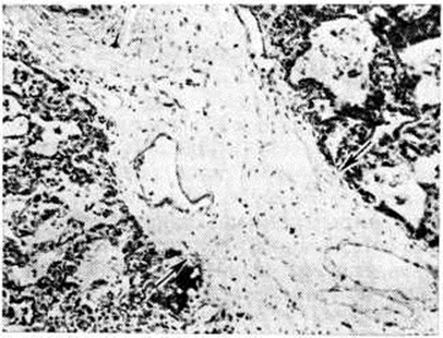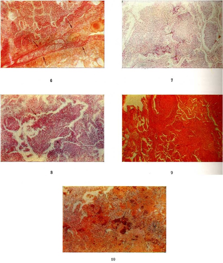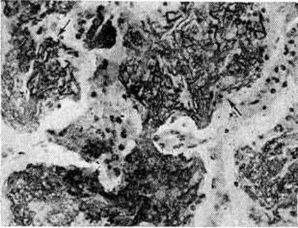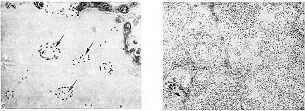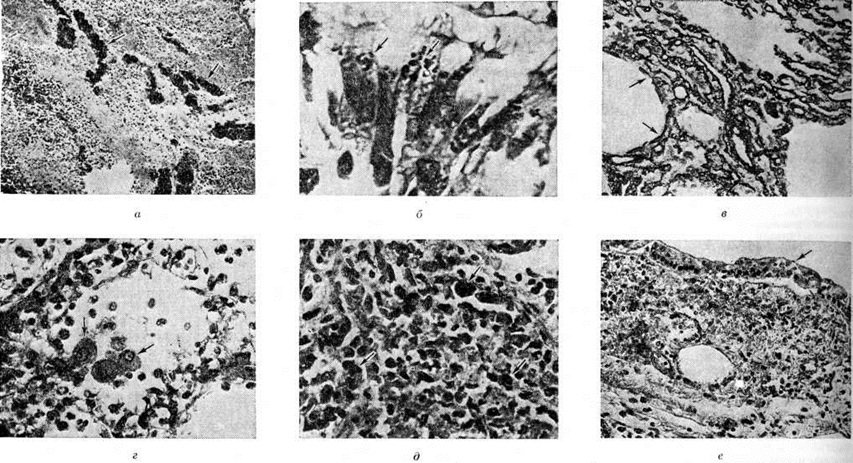 При пневмококковой Пневмония, в частности при её наиболее тяжёлом варианте — крупозной Пневмония, процесс начинается с развития небольшого очага серозного воспаления, располагающегося обычно в задних или в заднебоковых отделах лёгких, где содержатся пневмококки (рисунок 2, а). Патологический процесс распространяется прежде всего контактным путём и очень быстро захватывает значительную часть лёгкого — целую долю и даже несколько долей. Макроскопически лёгкое увеличено в объёме, его ткань резко отёчна и полнокровна. Эти изменения носят название стадии прилива. В дальнейшем в экссудате нарастает количество нейтрофильных лейкоцитов, нередко одновременно с фибрином серозно-гнойный экссудат постепенно заполняет просветы альвеол (рисунок 2,6); последние достигают при этом размеров, которые они имеют на вдохе; пневмококки в это время фагоцитируются лейкоцитами и исчезают. При прогрессировании болезни более выраженные нарушения определяются на границе с неизменённой тканью органа. На разрезе лёгкое серого цвета с мелкозернистой или гладкой поверхностью, по консистенции напоминает печень (серая гепатизация лёгкого). У больных с повышенной проницаемостью сосудов к экссудату присоединяется большое количество эритроцитов, в результате чего лёгкое приобретает серо-красный или темно-красный цвет (красная гепатизация лёгкого). В период выздоровления происходит рассасывание выпота; макроскопически в этот период лёгкие характеризуются пониженной воздушностью и эластичностью. При очаговой пневмококковой Пневмония отмечаются сходные изменения, но с меньшей степенью выраженности. Стафилококковая Пневмония имеет ряд особенностей. На ранних стадиях заболевания вокруг скоплений стафилококков появляется серозный или чаще серозно-геморрагический экссудат с небольшой примесью нейтрофильных лейкоцитов. В дальнейшем очаги воспаления приобретают характерное зональное строение. В центре их содержится много стафилококков, возникают некротические изменения (рисунок 3, а), вокруг участков некроза накапливаются лейкоциты, которые фагоцитируют стафилококки. В периферических участках пневмонического очага альвеолы содержат фибринозный или серозный экссудат, в котором нет бактерий. При тяжёлом течении болезни (стафилококковой деструкции лёгких) в местах скоплений стафилококков на значительном протяжении происходит разрушение лёгочной ткани. Макроскопически в лёгких выявляются множественные мелкие, нередко сливающиеся очаги абсцедирующей Пневмония Они красного или темно-красного 4 цвета с желтовато-серыми участками расплавления в центральной части. Позднее здесь формируются абсцессы,. принимающие иногда хронический течение. При распространении инфекционные процесса на плевру и её деструкции возникает сообщение между полостью абсцесса, бронхами и плевральной полостью, развивается пиопневмоторакс (смотри полный свод знаний). Иногда в результате деструкции стенки бронха и проникновения воздуха в интерстиций возникает интерстициальная эмфизема. Стрептококковая Пневмония имеет много общих черт со стафилококковой. Однако в тяжёлых случаях она характеризуется большей степенью некроза клеток экссудата и лёгочной ткани, а также более выраженной лимфогенной генерализацией процесса. Для Пневмония, вызванной синегнойн