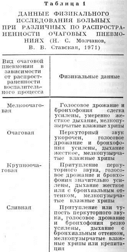 Особенности клинического течения острой пневмонии различной этиологии. При описании особенностей клинические, течения острой Пневмония в зависимости от этиологического фактора целесообразно выделять пневмонию инфекционной и неинфекционной этиологии. Пневмонии инфекционной этиологии могут вызываться бактериями, вирусами, грибками и сопутствовать различным инфекционные болезням. Пневмококковая Пневмония чаще всего протекает по типу крупозной или очаговой Пневмония, клинические, характеристика которых приведена выше. Пневмония, вызванная палочкой Пфейффера (Haemophilus influenzae), нередко возникает у больных с хронический бронхитом, бронхоэктазами, злокачественными опухолями, а также у больных гриппом. При этом поражаются главным образом нижние доли лёгких. Очаги поражения могут сливаться, захватывая всю долю. Характерно перибронхиальное распространение инфекции, поражение эпителия надгортанника, бронхов и бронхиол, что сопровождается сильным кашлем. Лейкоцитоз со сдвигом лейкоцитарной формулы влево наблюдается приблизительно у половины больных. Стафилококковая Пневмония (стафилококковая деструкция лёгких) с тяжёлым молниеносным течением наблюдается у детей, пожилых людей, а также у больных, ослабленных различными инфекциями или сопутствующими хронический заболеваниями. Первичная бронхогенная стафилококковая Пневмония начинается остро, часто на фоне или после гриппа. Появляются высокая температура, иногда спутанное сознание, одышка, боль в грудной клетке, кашель с гнойно-кровянистой мокротой. Тяжесть течения, выраженность одышки и цианоза часто не соответствуют первоначально выявляемой величине воспалительного очага в лёгком. На фоне притупления перкуторного звука и ослабленного везикулярного дыхания над зоной поражения вскоре начинают выслушиваться влажные мелкопузырчатые хрипы. Особенностью стафилококковой Пневмония является раннее (на 2—3-й день болезни) возникновение тонкостенных, не содержащих выпота, раздутых полостей. В дальнейшем появляются некротические полости с уровнем жидкости, септическая лихорадка, нарастает интоксикация, выделяется гнойная мокрота. Конфигурация и число некротических полостей в лёгком может быстро меняться. Нередко возникает прорыв гнойной полости в плевральную полость с образованием пиопневмоторакса. При вторичной гематогенной стафилококковой Пневмония заболевание вначале протекает без выраженной клинические, симптоматики. Спустя некоторое время состояние больного значительно ухудшается, появляются высокая лихорадка с потрясающими ознобами, одышка, боли в грудной клетке, сухой кашель, нарастает дыхательная недостаточность (смотри полный свод знаний). При аускультации ослабленное везикулярное дыхание чередуется с амфорическим, выслушиваются влажные хрипы. Нередко наблюдается кровохарканье и прорыв гнойных очагов в плевральную полость с образованием пиопневмоторакса (смотри полный свод знаний). Стрептококковая Пневмония встречается редко и в большинстве случаев является осложнением кори, коклюша, гриппа, а также различных острых респираторных или хронический болезней. Бронхогенное распространение инфекции приводит к появлению мелких пневмонических очагов в пределах одного сегмента и быстрому распространению инфекции по всему лёгкому с образова