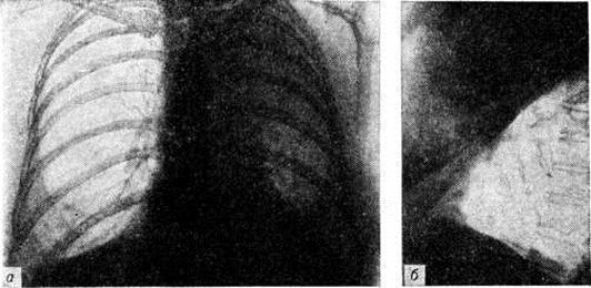 Стадия разрешения крупозной Пневмония рентгенологически проявляется снижением интенсивности тени и её фрагментацией. После рассасывания Пневмония усиление лёгочного рисунка на месте бывшего затемнения сохраняется в течение 3—4 недель В целях уточнения субстрата этого явления применяются пробы Вальсальвы и Мюллера. При проведении пробы Вальсальвы лёгочный рисунок становится беднее вследствие повышения внутрилёгочного давления и сужения сосудов; при пробе Мюллера лёгочный рисунок усиливается благодаря переполнению сосудов кровью. Лёгочный рисунок при проведении проб заметно не изменяется, если анатомическим субстратом патологический процесса является разрастание соединительной ткани, например, при пневмосклерозе. Наряду с изменениями лёгочных полей отмечается расширение и гомогенизация тени соответствующего корня лёгкого; эти изменения обычно наблюдаются в течение 3—4 недель после рассасывания воспалительных явлений в лёгочной ткани. Плевра на стороне поражения почти всегда оказывается утолщённой. В ряде случаев определяется жидкость в плевральной полости (плевропневмония); при небольшом количестве жидкости её выявлению способствует исследование больного на латероскопе в положении на больном боку (смотри полный свод знаний Полипозиционное исследование). При базальных Пневмония подвижность купола диафрагмы на стороне поражения, как правило, уменьшается. При благоприятном течении и полном рассасывании воспалительного процесса рентгенологическое картина нормализуется в среднем через 1—1,5 месяца. Среди наиболее часто встречающихся осложнений выделяют абсцедирующую Пневмония: рентгенологически на фоне затемнения выявляется одна или несколько полостей, содержащих жидкость и газ, разделённые горизонтальной границей (рисунок 7). Очаговая Пневмония рентгенологически проявляется наличием множества небольших участков затемнения, расположенных чаще всего в обоих лёгочных полях; размеры этих очаговых теней в большинстве случаев не превышают 1 сантиметров, что соответствует размерам лёгочных долек. Верхушки лёгких в большинстве случаев не поражаются. Очертания очаговых теней нечёткие, интенсивность их невелика (рисунок 8, а). Из-за наступающей гиперемии ткани лёгкого лёгочный рисунок усиливается. Тени корней лёгких расширяются и гомогенизируются. В местах наибольшей концентрации очагов отмечается реакция плевры в виде утолщения; нередко в плевральной полости выявляется выпот, большей частью в небольшом количестве. Подвижность диафрагмы часто ограничена. Для очаговой Пневмония, как и для большинства острых воспалительных процессов в лёгких, характерна быстрая динамика рентгенологическое картины: за 5—7 дней происходят существенные изменения, а через 1,5—2 недели очаги в большинстве случаев рассасываются. В связи с тем, что очаги при этом виде Пневмония возникают неодновременно, их рассасывание происходит также постепенно. В зависимости от размеров очагов принято различать 3 вида очаговой Пневмония: крупноочаговая Пневмония, при которой диаметр воспалительных фокусов равен приблизительно 1 сантиметров (встречается наиболее часто), среднеочаговые (диаметром 6— 8 миллиметров) и мелкоочаговые (диаметром 3— 5 миллиметров). Наряду с этими формами, при которых размеры очагов не превышают 1 сантимет