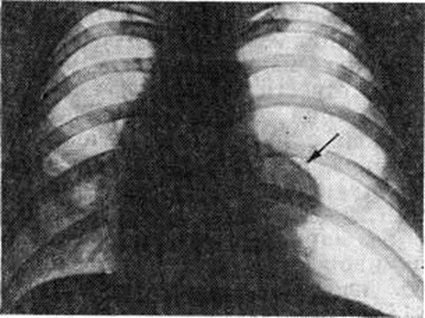 После ликвидации Пневмоторакс рентгенологическое признаки заболевания, предшествовавшего Пневмоторакс, определялись примерно у половины больных (52%), что свидетельствует о нередко бессимптомном течении патологический процесса в лёгком. Таким образом, спонтанный Пневмоторакс не менее чем в 2/3 случаев связан с хронический неспецифическими заболеваниями лёгких, протекающими с малой симптоматикой или субклинически, в основном с хронический бронхитом (смотри полный свод знаний) и эмфиземой лёгких (смотри полный свод знаний). С накоплением опыта диагностики (смотри полный свод знаний: Торакоскопия) и оперативного лечения спонтанного Пневмоторакс выяснилось, что в большинстве случаев преимущественно в верхних долях лёгких наблюдаются одиночные или множественные тонкостенные, иногда гроздевидные воздушные пузыри (буллы), расположенные под висцеральной плеврой. Буллы возникают при различных, как рубцовых, так и воспалительных процессах, ведущих к нарушению проходимости мелких бронхов, что создаёт затруднения в регионарной вентиляции лёгких и приводит к повышению давления в дистальных отделах воздухоносных путей. Тонкостенные воздушные пузыри формируются в результате разрыва перерастянутых, атрофированных межальвеолярных перегородок. Хотя конкретные причины бронхиальной обструкции, ведущей к очаговой субплевральной альвеолярной деструкции, могут быть различными, в том числе и перенесённый туберкулёз, длительное наблюдение за больными показывает, что буллы чаще всего являются проявлением диффузной эмфиземы (смотри полный свод знаний). Воздух, попадая под висцеральную плевру, может стать причиной её отслойки и образования иногда довольно больших подплевральных пузырей (блебс), а проникнув в средостение, обусловить появление медиастинальной эмфиземы. Спонтанный Пневмоторакс, осложняющий течение ряда диссеминированных процессов в лёгких (саркоидоз, гистиоцитоз X, лейомиоматоз, фиброзирующий альвеолит — болезнь Хаммена — Рича и другие), также связан с разрывом эмфизематозных булл или с нарушением целости полостных образований, являющихся проявлением исхода диффузного пневмосклероза в так называемый сотовое лёгкое. Единичные случаи врождённого семейного Пневмоторакс связывают с генетически детерминированной эмфиземой и врождённой неполноценностью висцеральной плевры. Спонтанный Пневмоторакс может быть вызван самопроизвольной перфорацией плевры при инфаркте лёгкого, солитарных или множественных кистах лёгких, ателектазе лёгкого, эозинофильном инфильтрате, абсцессе, гангрене, эхинококкозе лёгкого, силикозе. Туберкулёз лёгких, который в начале текущего столетия считали основной причиной Пневмоторакс, наблюдается не более чем в 10% случаев спонтанного Пневмоторакс У больных туберкулёзом лёгких спонтанный Пневмоторакс может возникнуть при прогрессировании туберкулёзного процесса, при ограниченных специфических изменениях, казеозной пневмонии, фиброзно-кавернозном процессе. В результате деструктивных изменений в плевре возможна перфорация субплеврально расположенного туберкулёзного очага, каверны. Кроме того, развитие спонтанного Пневмоторакс у больных туберкулёзом лёгких может произойти вследствие надрыва лёгкого натянувшимися плевральными сращениями. При эмпиеме плевры туберкулёзной