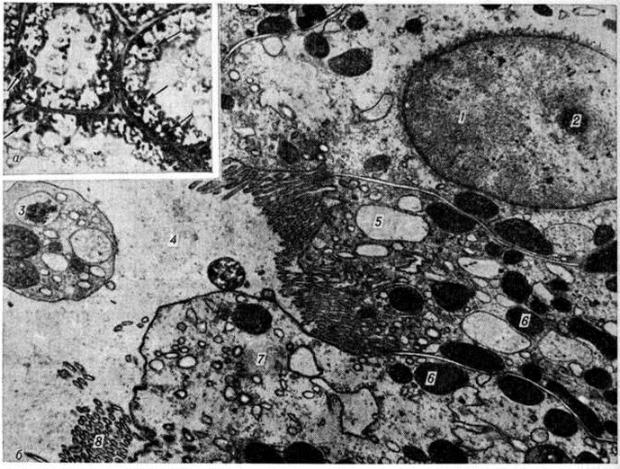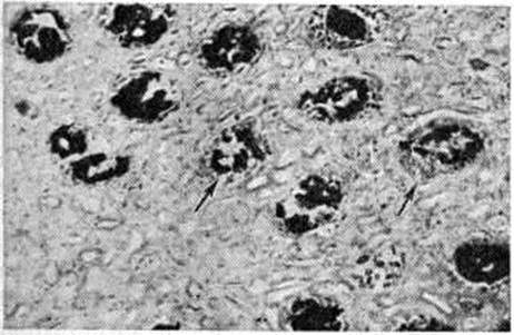 Патологическая анатомия. Морфологически изменения почек при острой Почечная недостаточность зависят от этиологии, периода болезни, своевременности, характера и объёма лечебный мероприятий. Макро и микроскопическая картина ишемических изменений почек, или так называемый шоковая почка (побледнение коркового вещества при полнокровии юкстамедуллярной зоны), чаще наблюдается при травматическом шоке, кровопотере и не характерна для процессов экзо и эндотоксического происхождения. При гистологический исследовании обнаруживают очаговые поражения эпителия канальцев с преобладанием гидропической дистрофии нефроцитов (рисунок 1). Электронно-микроскопическое исследование свидетельствует о выраженном и глубоком повреждении почечных канальцев: вакуолизации цитоплазмы вследствие расширения цистерн эндоплазматической сети; отёке или набухании митохондрий с появлением хлопьевидных уплотнений и фрагментацией крист; очаговой деструкции щёточной каёмки с парциальным отёком и секвестрацией апикальных отделов цитоплазмы. Реже развивается распространённый колликвационный некроз нефроцитов извитых почечных канальцев проксимальных и дистальных отделов нефрона. Все эти повреждения сопровождаются ферментными изменениями нефроцитов. Разрыв почечных канальцев (тубулорексис) считают типичным при шоке, хотя некоторые патологи считают это артефактом. При шоке, сопровождающемся гемолизом и миолизом, морфологический изменения в почках соответствуют гемоглобинурийному и миоглобинурийному нефрозу (смотри полный свод знаний: Миоглобинурия). После инфузионной терапии морфологический картина поражения почечных канальцев может изменяться: вследствие осмотического нефроза происходит вакуолизация, увеличиваются пиноцитозные пузырьки и наступает растяжение щёточной каёмки нефроцитов. В клубочках почечных телец отмечают малокровие, слущивание отдельных эндотелиоцитов с оголением базальных мембран, иногда субэндотелиальные отложения фибрина. Тромбоз капилляров клубочков как проявление диссеминированного внутрисосудистого свёртывания крови наблюдается чаще при бактериемическом шоке и патологически протекающей беременности. К проявлениям диссеминированного внутрисосудистого свёртывания крови с развитием генерализованного феномена Швартцмана— Санарелли (смотри полный свод знаний: Швартцмана феномен) относят также симметричный кортикальный некроз почек (смотри полный свод знаний: Геморрагический кортикальный некроз почек). Различают тотальную, субтотальную, сегментарную и малую формы некроза. При тотальной форме сохраняются почечные пирамиды; при субтотальной — в корковом веществе встречаются островки непоражённой ткани; при сегментарной — очаги некроза имеют вид инфарктов, окружённых геморрагиями; малые формы удаётся выявить только при микроскопическом исследовании. При затянувшейся острой Почечная недостаточность некротизованное корковое вещество почки истончается. Отравление этиленгликолем влечёт за собой симметричный кортикальный некроз почек, сочетающийся с гликолевым нефрозом, а при патологии беременности — с острой гемоглобинурией, апоплексией и некрозом коркового вещества надпочечников, некрозом передней доли гипофиза. Гистологически отмечается коагуляционный некроз коркового вещес