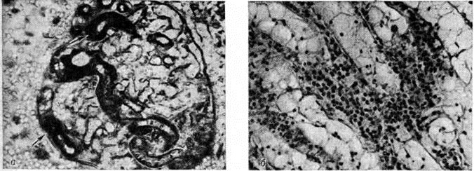 Характер поражения почек при отравлении некоторыми химический веществами, лекарственными средствами, ядами растительного и животного происхождения (так называемый экзотоксическая почка) во многом зависит от свойств ядов и их метаболитов. Нефротоксический эффект ядов тиоловой группы (соединения тяжёлых металлов и другие) в виде характерного коагуляционного некроза эпителия почечных канальцев обусловлен блокадой сульфгидрильных групп ферментных и структурных белков. Классическим примером некронефроза является так называемый сулемовая почка. Характерные для неё макро и микроскопические изменения дают в начале 1-й недели в связи с резким полнокровием сосудов большую красную сулемовую почку; к концу 1-й недели — малую бледную сулемовую почку с распространённым коагуляционным некрозом эпителия, отторжением секвестров и регенерацией нефроцитов почечных канальцев; на 2-й неделе — большую бледную сулемовую почку (на разрезе широкое бледно-серое корковое вещество почки контрастирует с ярко-розовыми влажными почечными пирамидами). Гистологически наблюдается: расширение почечных канальцев, регенерация эпителия (эндотелиоподобные гетерохромные клетки с уродливыми ядрами, митозами, амитозами); образование симпластов; в почечных пирамидах— круглоклеточные инфильтраты вокруг цилиндров. При гликолевом нефрозе почка увеличена, на разрезе влажная; гистологически определяется баллонная дистрофия эпителия канальцев проксимальных и дистальных отделов нефрона(рисунок 2, б) с кристаллами оксалатов в их просвете и внутри клеток. Электронно-микроскопическое исследование выявляет образование вакуолей в результате резкого расширения цистерн эндоплазматической сети. Нефроциты в состоянии баллонной дистрофии могут длительно не отторгаться, замедляя регенерацию ткани почки. Поражение почек при отравлениях хлорированными углеводородами имеет некоторые особенности. При отравлении дихлорэтаном отмечается жировая дистрофия нефроцитов почечных канальцев проксимальных и дистальных отделов нефрона. Четыреххлористый углерод и хлороформ вызывают гидропическую дистрофию нефроцитов извитых почечных канальцев с образованием крупных вакуолей вследствие расширения цистерн эндоплазматической сети. Острый гемоглобинурийный нефроз развивается при отравлении гемолитическими ядами (уксусной кислотой, мышьяковистым водородом, медным купоросом, аминосоединениями, нитросоединениями и другие). При этом морфологический изменения отражают транспорт гемоглобина по системе нефрона; для макроскопической картины типична черно-бурая радиальная исчерченность почечных пирамид, обусловленная наличием пигментных цилиндров (рисунок 3), дающих положительную реакцию Лепене (смотри полный свод знаний: Лепене способ) с бензидином. При отравлении уксусной кислотой гистологически обнаруживается поражение эпителия канальцев проксимальных отделов нефрона, обусловленное реабсорбцией гемоглобина, который выявляется в виде бензидин-положительных гранул в цитоплазме; при электронно-микроскопическом исследовании обнаруживается резорбция гемоглобина в вакуолях клеток с парциальным некрозом апикальных отделов, «перегруженных» пигментом, процесс сопровождается разрывом канальцев дистальных отделов нефрона с выходом в строму содержим