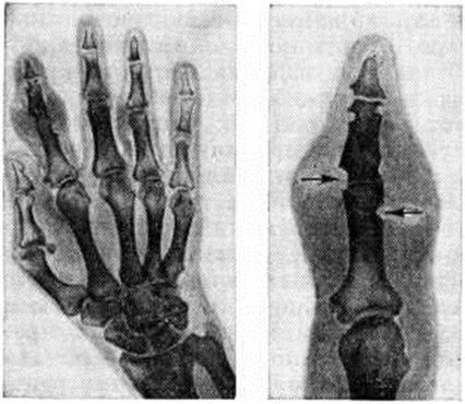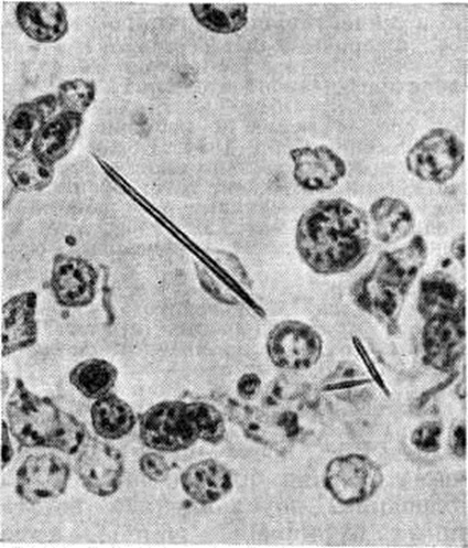 Наиболее яркий симптом Подагра— острый артрит (смотри полный свод знаний: Артриты) — развивается вследствие отложения в суставной полости уратовых микрокристаллов, способных активировать фактор Хагемана (смотри полный свод знаний: Геморрагические диатезы), компоненты комплемента, кинины, что приводит к увеличению сосудистой проницаемости (смотри полный свод знаний) и притоку нейтрофилов. Фагоцитоз кристаллов сопровождается высвобождением лизосомальных ферментов, в результате чего развивается воспаление (смотри полный свод знаний). Патогенез другого часто встречающегося клинические, проявления Подагра— поражения почек различен. В одних случаях, при развитии так называемый у ратной, или подагрической, нефропатии, основное значение имеет длительная гиперурикемия. Кристаллы уратов откладываются при этом преимущественно в интерстиции почек и канальцах. В других случаях, при развитии мочекаменной болезни (смотри полный свод знаний: Уролитиаз), патогенетическое значение имеет, прежде всего, повышенное выделение мочевой кислоты с мочой. Патологическая анатомия. При Подагра происходит отложение кристаллов уратов в суставных хрящах, эпифизах костей, околосуставных тканях, почках и других органах. Микроскопические изменения зависят от степени поражения и распространённости процесса. Отложения кристаллов инфильтрируют окружающие ткани, образуя подагрические узлы — тофусы — с развитием по периферии грануляционно-рубцовой ткани (цветной таблица, ст. 49, рисунок 1). Отложения кристаллов на поверхности суставного хряща вначале имеют вид беловатых пятен, затем суставная поверхность выглядит, как покрытая гипсом. Для гистологический исследования препараты фиксируют в абсолютном спирте или в смеси формалина и абсолютного спирта, так как кристаллы уратов растворяются в формалине. Микроскопически кристаллы уратов имеют форму прямых, кривых и S-образных тонких игл (рисунок 1) длиной до 0,06 сантиметров, которые располагаются в виде лучей, глыбок и дисков. Отложения уратов вызывают местный некроз тканей. Вокруг этого участка развивается воспалительная реакция с инфильтратом из гистиоцитов, лимфоидных, плазматических клеток и большого числа гигантских клеток, содержащих фагоцитированные кристаллы. Вокруг воспалительного инфильтрата может образовываться фиброзная капсула. Отложение уратов в синовиальной оболочке приводит к возникновению синовита (смотри полный свод знаний), длительное течение которого (хроническая Подагра) характеризуется развитием грануляционной ткани в виде паннуса, вызывающего деструкцию суставного хряща, субхондрального отдела кости и в редких случаях анкилоз сустава (смотри полный свод знаний: Анкилоз). В субхондральном отделе кости, где откладываются ураты, происходят вторичные изменения по типу микропереломов с образованием фиброзных и костных мозолей, развитием кист и остеосклероза (смотри полный свод знаний). Патологический процесс в почках при Подагра бывает двух типов. Преимущественное отложение уратов в интерстиции и эпителии канальцев приводит к развитию абактериального воспаления — пиелонефрита (смотри полный свод знаний) — и последующему склерозу почечной ткани. Второй тип поражения почек характеризуется отложением кристаллов уратов в собирательных почечных трубочках, поче