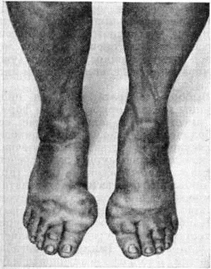 Подкожные тофусы бывают размером от нескольких миллиметров до 2—3 сантиметров и более в диаметре. Тофусы меньших размеров, если они располагаются близко к поверхности кожи, выглядят как желтовато-беловатые образования, просвечивающие сквозь кожу и иногда приподнимающие эпидермис. При более глубокой подкожной локализации тофусы имеют вид узловатых, круглых, клубневидных образований плотной, иногда хрящеподобной консистенции. Обычно тофусы безболезненны, но при обострении местного воспалительного процесса может отмечаться болезненность, размягчение тофуса, гиперемия кожных покровов над ним. Иногда целостность последних нарушается, и через образовавшийся дефект содержимое тофуса — белая пастообразная масса — выходит наружу. Размеры узла при этом уменьшаются, а в некоторых случаях он исчезает полностью. Тофусы могут иметь различную локализацию, но чаще они располагаются в области ушных раковин и разгибательной поверхности суставов. Хронический поражение почек — второе по частоте и прогностически наиболее серьёзное проявление Подагра Первый тип поражения почек — уратная, или подагрическая, нефропатия — характеризуется преимущественным поражением интерстиция и почечных канальцев и проявляется главным образом небольшой и непостоянной альбуминурией (смотри полный свод знаний: Протеинурия), цилиндрурией и лейкоцитурией, а также артериальной гипертензией (смотри полный свод знаний: Гипертензия артериальная). Особенностью подагрической нефропатии является то, что она обычно длительно протекает бессимптомно или имеет незначительную непостоянную симптоматику и прогрессирует обычно медленно. У 17—25% больных Подагра отмечается хроническая почечная недостаточность (смотри полный свод знаний). Второй тип поражения почек (и других отделов мочевой системы) характеризуется образованием уратных камней. Мочекаменная болезнь наблюдается у 10—25% больных первичной Подагра и вдвое чаще при вторичной Подагра Примерно у х/3 больных мочекаменная болезнь может предшествовать приступам артрита. Частота образования камней в мочевой системе при Подагра коррелирует с выраженностью гиперурикозурии. Мочекаменная болезнь развивается у половины больных, у которых выделение мочевой кислоты с мочой составляет 1 грамм и более в сутки. Клинические, проявления такие же, как при мочекаменной болезни другой этиологии; особенностью является частое бессимптомное течение. В отдельных случаях Подагра, главным образом у больных вторичной, развившейся на фоне гематологических заболеваний при лечении цитостатическими препаратами, и у больных первичной Подагра при резком повышении уровня мочевой кислоты, может развиваться острая почечная недостаточность. Это происходит в результате массивной преципитации кристаллов мочевой кислоты в собирательных трубочках почек и мочеточниках. Атипичное течение первичной Подагра характеризуется частыми приступами острого артрита уже на ранних стадиях болезни, быстрым развитием хронический артрита, поражением суставов верхних конечностей. Такое течение первичной подагры наблюдается относительно редко. В то же время подобное развитие болезни типично для вторичной подагры. Синдром Леша—Найхана, одним из проявлений которого является Подагра, наблюдается только у мальчиков (в возрасте от 6 ме