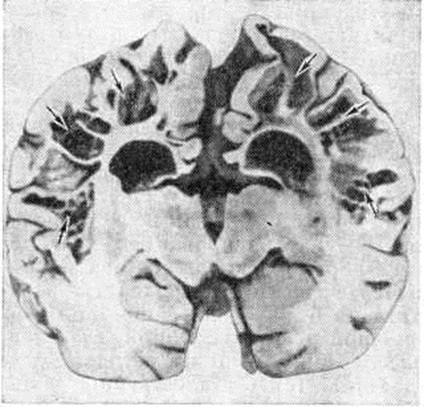 Различают истинную и ложную Порэнцефалия При истинной Порэнцефалия кисты могут сообщаться с желудочками мозга, являясь как бы их дивертикулами, иногда распространяющимися до наружной поверхности полушария головного мозга (рисунок 1). Реже кистозные полости с желудочками мозга не сообщаются. Величина кист очень вариабельна; некоторые из них иногда могут занимать половину и более половины полушария головного мозга, Внутренняя поверхность кисты чаще всего гладкая, выстлана эпендимоподобной оболочкой. Если киста сообщается с желудочками мозга, она содержит цереброспинальную жидкость, а если не сообщается — кистозную желтоватую жидкость с большим количеством белка, Микроскопически в стенке кисты выявляются участки, образованные гетеротопированной, имеющей неправильное строение корой головного мозга. В стенках кист иногда обнаруживают гемоглобиногенную пигментацию (следы очаговых кровоизлияний) и мелкие аноксические некрозы. Боковые желудочки часто имеют неправильную форму и расширены, особенно в области прилегания порэнцефалической кисты. Извилины полушарий головного мозга радиально погружены в направлении кисты, а иногда в этой области совсем отсутствуют и на их месте имеется лишь тонкая пластинка из мозгового вещества и мягкрй оболочки головного мозга, кратерообразно западающая при вскрытии полости. Гистологический изменения в ближайших к кисте извилинах головного мозга характеризуются выраженным разрежением ганглиозных клеток и неправильной ориентировкой клеточных слоев. В мягкой оболочке головного мозга отмечаются очаговые некрозы. Эти изменения указывают на раннее возникновение истинной Порэнцефалия