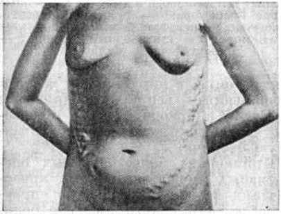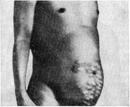 Застой крови в воротной вене часто ведёт к развитию спленомегалии и задержке крови в селезёнке (смотри полный свод знаний: Гепато-лиенальный синдром). При выраженной Портальная гипертензия, особенно, если она является следствием внутрипечёночного блока, нередко развивается асцит (смотри полный свод знаний). В образовании асцитической жидкости значительная роль принадлежит избыточному лимфообразованию в печени, усилению экстравазации в сосудах её микроциркуляторного русла. Интенсификация экстравазации, приводящая к образованию асцита, определяется не только повышением гидростатического давления в синусоидах и венулах, но и уменьшением онкотического давления плазмы вследствие гипопротеинемии, а также задержкой натрия и повышением осмотического давления в ткани печени за счёт возрастания молярной концентрации в результате обменных нарушений, вызванных гипоксией. Патологическая анатомия. Патологоанатомические изменения при внутрипечёночной и надпечёночной форме Портальная гипертензия обусловлены вызвавшими их заболеваниями (смотри полный свод знаний: Киари болезнь, Циррозы печени). При внепечёночной Портальная гипертензия печень может быть уменьшена в размерах, без признаков цирроза, отмечается лишь некоторый фиброз портальных сосудов. Селезёнка увеличена, нередко с постинфарктными рубцами и массивными сращениями с окружающими тканями. При гистологический исследовании селезёнки определяется в той или иной степени фиброадения её пульпы. Сосуды портальной системы дистальнее препятствия расширены, деформированы с неравномерно склерозированными стенками (рисунок 1). Расширенные коронарная вена желудка (левая желудочная вена) и вены подслизистого слоя пищевода выбухают в просвет, иногда на некотором протяжении стенки их истончены. Основные стволы портальной системы могут быть полностью облитерированы с образованием густой сети расширенных, деформированных сосудов брыжейки тонкой кишки, области селезёнки и желудка. Клиническая картина синдрома Портальная гипертензия характеризуется следующими симптомами: а) возникновение коллатерального кровообращения — расширение вен на передней брюшной стенке, варикозное расширение вен пищевода и желудка, геморроидальных вен; б) спленомегалия; в) гиперспленизм; г) геморрагические проявления (кровотечение из вен пищевода и кардии желудка, слизистой оболочки носа, дёсен, маточные кровотечения, геморроидальные кровотечения; д) асцит. При циррозе печени и болезни Киари перечисленные симптомы проявляются на фоне печёночной недостаточности (смотри полный свод знаний). Нередко первым симптомом, выявляющим заболевание (особенно при внепечёночной форме Портальная гипертензия), является случайно обнаруженная увеличенная селезёнка или внезапно возникшее кровотечение из вен пищевода. Больные жалуются на общее недомогание, чувство тяжести в левом подреберье, иногда сопровождающееся болями и повышением температуры, метеоризм, увеличение живота. У больных с асцитом часто выявляются расширенные вены на передней брюшной стенке вокруг пупка (голова медузы) либо по направлению к грудной клетке или надлобковой области (рисунок 2) с характерным при аускультации шумом волчка над ними. Портокавальные анастомозы возникают при внутрипечёночном блоке портальной системы в 