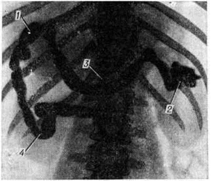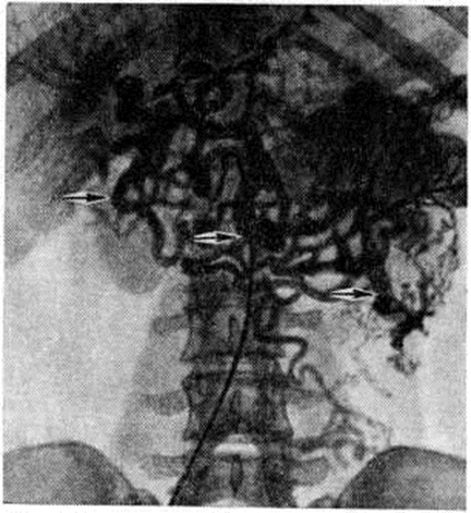 Наиболее грозным симптомом Портальная гипертензия является кровотечение из вен пищевода и желудка (смотри полный свод знаний: Желудочно-кишечное кровотечение), возникающее иногда внезапно на фоне полного благополучия. Кровотечение проявляется обильной кровавой рвотой (смотри полный свод знаний: Гематемезис), меленой (смотри полный свод знаний). Оно может рецидивировать и нередко заканчивается смертью больного. Летальность от кровотечения из вен пищевода остаётся высокой, особенно при циррозе печени (45—60%), больные погибают от острой печёночной недостаточности, развивающейся в результате кровопотери. Больные с внепечёночной Портальная гипертензия переносят кровотечение легче, летальность при этом значительно ниже (5—10%). Нередко после массивного кровотечения у больных циррозом печени впервые возникает асцит, активируется процесс в печени, ухудшается его течение. У больных с внепечёночной Портальная гипертензия асцита, как правило, не бывает. При болезни Киари асцит стойкий и превалирует над всеми другими симптомами. Длительный стойкий асцит ведёт к истощению, адинамии, развитию печёночной, почечной и сердечно-лёгочной недостаточности. При Портальная гипертензия селезёнка всегда увеличена. Размеры её варьируют в широких пределах. Нередко больные отмечают чувство тяжести и боли в левом подреберье, которые обусловлены обширными сращениями селезёнки с окружающими тканями, а также инфарктами селезёнки (смотри полный свод знаний). При кровотечении селезёнка резко сокращается, иногда перестаёт пальпироваться, а затем постепенно вновь увеличивается до прежних размеров. Спленомегалия (смотри полный свод знаний) сопровождается гиперспленизмом, часто количество тромбоцитов снижается до 80 000 — 30 000, количество лейкоцитов — до 3000—1500 в 1 микролитров крови. Наблюдается умеренная анемия, после кровотечения значительная, трудно поддающаяся лечению. Диагноз. Диагностика синдрома Портальная гипертензия и его форм часто невозможна без специальных методов исследования, из которых наиболее информативными являются рентгено-ангиографические методы (смотри полный свод знаний: Кавография, Мезентерикография, Портография, Спленопортография, Целиакография), эзофагоскопия (смотри полный свод знаний), гастроскопия (смотри полный свод знаний), спленоманометрия (смотри полный свод знаний: Селезёнка) и другие Для измерения портального давления применяют чрескожную спленоманометрию. Методика осуществляется путём пункции селезёнки и присоединения к игле аппарата Вальдмана для измерения венозного давления. При Портальная гипертензия давление в селезёнке, отражающее давление в портальной системе, достигает в среднем 350—450 миллиметров водного столба (в норме 50—115 миллиметров водного столба). Наибольшую информативность об уровне блокады портального кровообращения и состоянии сосудов даёт спленопортография. При внутрипечёночной Портальная гипертензия спленопортальное русло проходимо, расширено с резким обеднением сосудистого рисунка печени, иногда выявляются расширенные вены желудка и пищевода, расширенная пупочная вена (рисунок 4). При внепечёночной Портальная гипертензия отмечается разнообразная картина в зависимости от уровня блокады (рисунок 5), вплоть до полной непроходимости спленопортального русла. В этом случае дл
