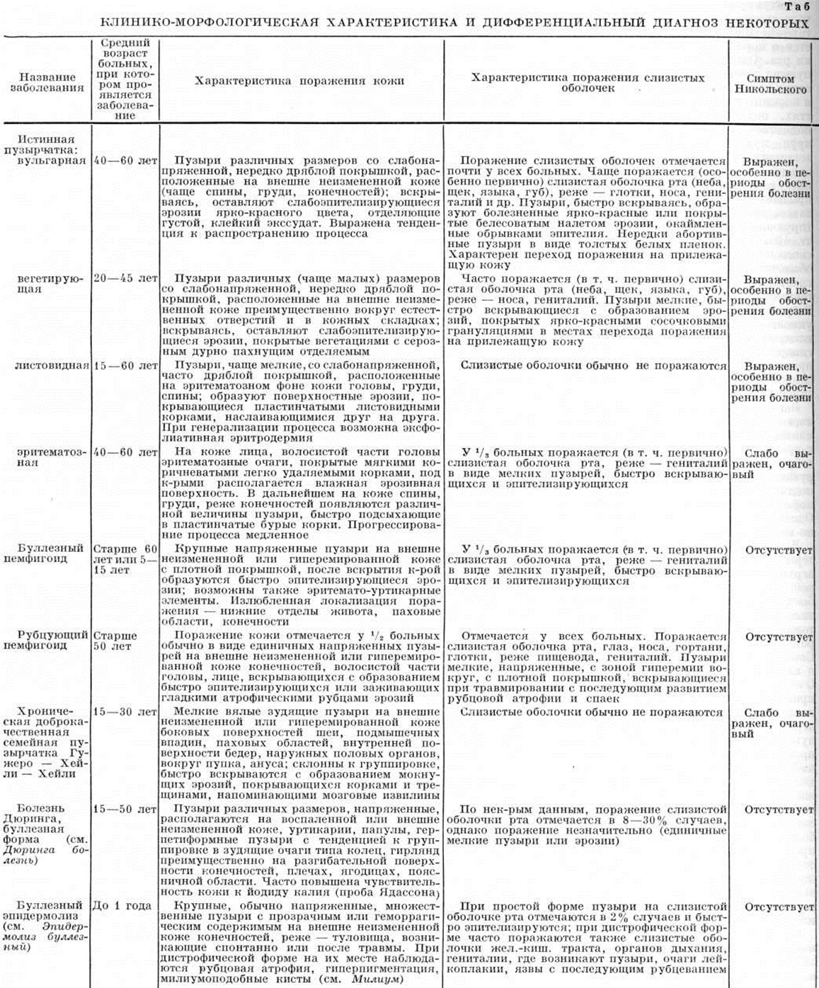 Вегетирующая пузырчатка в начале своего развития сходна с вульгарной. Заболевание часто начинается с поражения слизистой оболочки рта. Однако уже с самого начала пузыри имеют тенденцию к локализации вокруг естественных отверстий п в кожных складках (паховых областях, под молочными железами, в подмышечных ямках), а также вокруг пупка. В дальнейшем при вскрытии пузырей на поверхности эрозий развиваются папилломатозные разрастания (вегетации), покрытые сероватым налётом. Сливаясь, они образуют обширные вегетирующие поверхности (цветной рисунок 1). Симптом Никольского положительный. На слизистых оболочках вегетации редки, но на границе с кожей (область губ, носа, гениталий, ануса) встречаются часто. Регрессируя, вегетации ссыхаются, уплощаются, а эрозии эпителизируются, оставляя на коже выраженную гиперпигментацию. Заболевание протекает хронически пли подостро (злокачественно); заканчивается летально. Вегетирующую Пузырчатка весьма напоминает хроническая вегетирующая пиодермия Аллопо (смотри полный свод знаний: Пиодермия), которую иногда рассматривают как доброкачественный вариант вегетирующей Пузырчатка, что в некоторых случаях подтверждается результатами иммунофлюоресцентных исследований. Однако эта точка зрения окончательно не доказана. Листовидная пузырчатка характеризуется высыпанием на коже поверхностных, плоских, вялых пузырей с тонкой покрышкой, которая быстро разрывается и обнажает эрозии или ссыхается с образованием тонких пластинчатых чешуйкокорок, наслаивающихся друг на друга. Симптом Никольского ярко выражен и на непоражённых участках кожи. Очень быстро патологический процесс распространяется по всей поверхности кожи и принимает характер эритродермии с крупнопластинчатым шелушением. Слизистые оболочки, как правило, не поражаются. Нередко наблюдается выпадение волос и отхождение ногтей. Нарушения водного и солевого обмена менее выражены, чем при вульгарной Пузырчатка Заболевание может длиться 2—5 лет и более. Общее состояние больных на протяжении многих месяцев может оставаться удовлетворительным, но постепенно они слабеют, теряют в весе и без соответствующей терапии погибают от нарастающей кахексии или от присоединившейся инфекции. Бразильская пузырчатка — эндемическое, предположительно инфекционные заболевание, наблюдающееся в Южной Америке, главным образом в районе реки Амазонки. Возраст больных — 10— 30 лет (редко 5—6 лет). Различают листовидную, пустулёзную, буллезную, дистрофическую, эритродермическую, папилломатозную, веррукозную, герпетиформную стадии заболевания. В острых и под острых случаях отмечается повышение температуры, в хронических, кроме кожных поражений, наблюдаются анкилозы крупных суставов, атрофия мышц, молочных желёз, яичек, остеопороз (смотри полный свод знаний), остеомаляция (смотри полный свод знаний). Возможен гиперкератоз ладоней и подошв, а также поражение кожи по типу acanthosis nigricans (смотри полный свод знаний). Слизистые оболочки не поражаются. Симптом Никольского положительный. Болезнь обычно протекает хронически в течение 5—20 лет, иногда подостро или остро. Примерно половина больных погибает. Эритематозная пузырчатка начинается с образования на коже лица, чаще носа и щек (в виде бабочки), реже на волосистой части головы, очага поражения, покрытого мягким