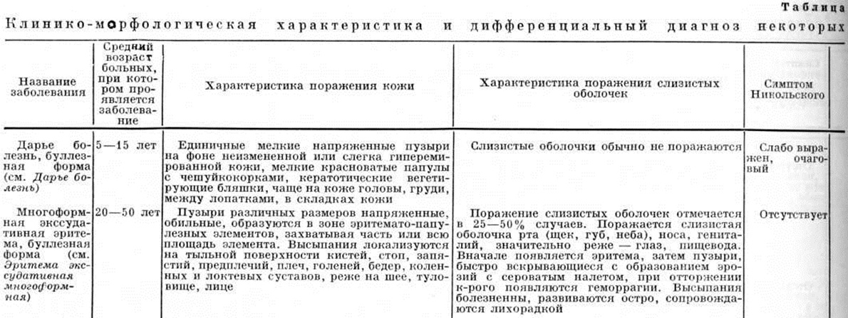 Начинается она, как правило, с поражения слизистой оболочки рта, которое может существовать изолированно на протяжении нескольких месяцев. Пузыри, быстро вскрываясь, образуют болезненные, ярко-красные или покрытые белесоватым налётом эрозии (смотри полный свод знаний), окаймлённые обрывками эпителия — остатками покрышки пузыря. Часто первичные проявления вульгарной Пузырчатка на слизистых оболочках выглядят в виде толстых, белых или сального цвета плёнок, представляющих собой покрышки абортивных пузырей. Высыпания на коже появляются исподволь, сначала в виде единичных пузырей преимущественно на коже груди и спины, затем количество их увеличивается. Пузыри располагаются на внешне неизменённой коже, наполнены прозрачным серозным содержимым, имеют различную величину. Просуществовав несколько дней, они подсыхают, покрываясь корками, или вскрываются с образованием эрозий ярко-красного цвета, обильно отделяющих густой клейкий экссудат (цветной рисунок 3). Иногда вульгарная Пузырчатка начинается с весьма ограниченного поражения кожи, так называемый пемфигозного первичного аффекта, напоминающего импетиго (смотри полный свод знаний), рак Педжета (смотри полный свод знаний: Молочная железа, опухоли) или эксфолиативный хейлит (смотри полный свод знаний). Акантолиз можно выявить путём лёгкого трения пальцами здоровой на вид кожи. При этом вблизи пузырей, а иногда и в отдалении от них происходит отслойка поверхностных слоёв эпидермиса с образованием эрозий (симптом Никольского). При потягивании за обрывки покрышки пузыря происходит отслойка верхних слоёв эпидермиса далеко за пределами видимой эрозии (краевой симптом Никольского). Акантолизом обусловлено также увеличение площади пузыря при надавливании на него пальцем (симптом Асбо-Хансена), приобретение пузырём формы груши под тяжестью экссудата, периферический рост эрозий. Общее состояние больных в начале заболевания нарушено мало. Беспокоит боль, причиняемая эрозиями, особенно сильная на слизистой оболочке рта, что затрудняет приём пищи. Постепенно состояние ухудшается, появляются слабость, субфебрильная температура. При присоединении пиогенной флоры температура может подниматься до более высоких цифр. При прогрессировании вульгарной Пузырчатка эрозии как на слизистых оболочках, так и на коже эпителизируются медленно. Характерным для вульгарной Пузырчатка является нарушение водного и особенно солевого обмена. Суточное выделение с мочой хлорида натрия резко снижено. Задержка хлорида натрия наблюдается нередко в самых ранних периодах болезни даже при изолированном поражении слизистых оболочек. При отсутствии надлежащего лечения нарастающая кахексия приводит к летальному исходу. Длительность заболевания (без лечения) — от 6 месяцев до 2 лет, у молодых больных вульгарная Пузырчатка протекает более остро. Подострая злокачественная разновидность вульгарной пузырчатки начинается с поражения слизистой оболочки рта после гриппа, ангины, удаления и протезирования зубов. Кожа поражается через 6— 12 недель Патологический процесс отличается интенсивным ростом пузырей, их слиянием, образованием обширных эрозий, по краям которых нависают белые плёнки. Симптом Никольского резко положительный. Общее состояние тяжёлое: отмечаются интоксикация, отеки, лихорадка. З