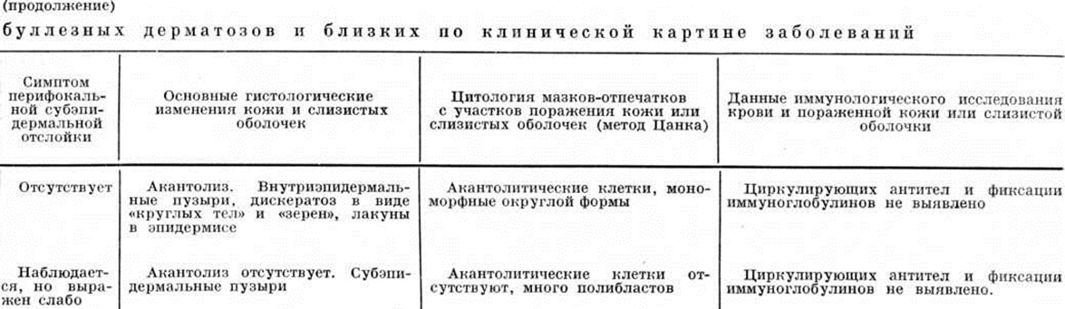 Для наружного лечения применяют тёплые ванны с перманганатом калия, антибактериальные мази или водные растворы анилиновых красителей. При поражении слизистых оболочек — обмывания и полоскания отваром ромашки пополам с 2% раствором борной кислоты, растворами буры, фурацилина и другими вяжущими и дезинфицирующими средствами. Прогноз. Наибольшая смертность больных истинной Пузырчатка наблюдается в первые 3 года от начала заболевания. Современные методы лечения позволили снизить смертность в три раза и более. Профилактика не разработана. Буллезный пемфигоид (синонимы: неакантолитическая Пузырчатка, доброкачественная хроническая Пузырчатка, старческая Пузырчатка, юношеская Пузырчатка, старческий герпетиформный дерматит, парапемфигус) чаще наблюдается у пожилых людей и детей. Иногда развивается как параонкологический дерматоз (смотри полный свод знаний). Заболевание начинается с появления на внешне неизменённой коже или на фоне эритем крупных напряжённых пузырей с серозным или серозно-геморрагическим содержимым (рисунок). Образование пузырей при буллезном пемфигоиде связано с отслоением эпидермиса от дермы и формированием полости, содержащей фибринную сетку, свернувшуюся сыворотку и клетки крови, главным образом эозинофилы. У некоторых больных первичным проявлением буллезного пемфигоида могут быть элементы, типичные для многоформной экссудативной эритемы (смотри полный свод знаний: Эритема экссудативная многоформная). При вскрытии пузырей образуются эрозии, характеризующиеся, в отличие от Пузырчатка, отсутствием периферического роста и выраженной тенденцией к заживлению. По мере прогрессирования болезни количество пузырей увеличивается, преимущественно на сгибах и в складках тела. Примерно в 30% случаев в процесс вовлекается слизистая оболочка рта, а у 10% больных он начинается с её поражения. Симптом Никольского отрицательный, однако при потягивании за обрывки покрышки пузыря выявляется симптом перифокальной субэпидермальной отслойки. Перифокальную отслойку эпидермиса можно наблюдать также при надавливании на пузырь. Последний при этом сплющивается и расширяется (симптом Асбо-Хансена). Заболевание отличается хронически-рецидивирующим доброкачественным течением. Диагноз устанавливают на основании клинические, гистологический и иммунологический исследований. При электронно-микроскопическом исследовании наблюдают расслоение базальной мембраны: дном пузыря при буллезном пемфигоиде является электронно-плотная зона собственно базальной мембраны. С помощью непрямой реакции иммунофлюоресценции примерно у 2/3 больных буллезным пемфигоидом выявляют циркулирующие антитела класса IgG против базальной мембраны в сыворотке крови и пузырной жидкости. Прямая реакция иммунофлюоресценции выявляет линейное отложение иммуноглобулинов класса G вдоль базальной мембраны как в поражённой, так и здоровой на вид коже. На основании электронно-микроскопических и иммунологических исследований как вариант буллезного пемфигоида рассматривают герпес беременных (смотри полный свод знаний: Герпес). Лечение больных буллезным пемфигоидом аналогично лечению больных истинной Пузырчатка, но поддерживающая кортикостероидная терапия не является необходимой. Прогноз для жизни благоприятный. Профилактика не разработ