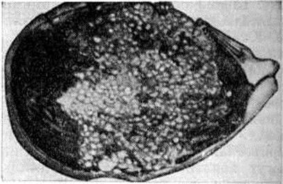 Возникновение текалютеиновых кист при Пузырный занос связывают о гиперстимуляцией текалютеиновых клеток хорионическим гонадотропином (смотри полный свод знаний), продуцируемым в большом количестве пролиферирующим трофобластом. После удаления, изгнания или рождения Пузырный занос текалютеиновые кисты подвергаются обратному развитию. Клиническая картина. В подавляющем большинстве случаев Пузырный занос возникает в связи с маточной беременностью. На ранних стадиях развития Пузырный занос течение беременности часто ничем не отличается от нормального. Если в этот период не происходит выкидыша (смотри полный свод знаний: Самопроизвольный аборт), то в дальнейшем при прогрессирующем Пузырный занос размеры матки увеличиваются намного быстрее, чем при нормальной беременности. Несоответствие между сроком беременности и величиной матки наблюдается примерно в 50% случаев. На 2—3-м месяце беременности появляются постоянные или периодические кровянистые выделения из влагалища (смотри полный свод знаний: Маточные кровотечения). Иногда наблюдается профузное кровотечение, сопровождающееся массивной кровопотерей. Как следствие кровопотери часто развивается анемия; в некоторых случаях выраженность анемии не соответствует сравнительно небольшой кровопотере. Характерно появление симптомов раннего и позднего токсикоза беременных (смотри полный свод знаний). При тяжёлом позднем токсикозе, развившемся до 24-й недели беременности, можно заподозрить Пузырный занос Редко беременные жалуются на боли в животе, которые могут быть обусловлены быстрым увеличением матки. Возможно увеличение яичников при развитии текалютеиновых кист. Самопроизвольное изгнание (экспульсия) Пузырный занос наблюдается сравнительно редко; если это происходит, то обычно при сроке беременности до 4 месяцев Иногда наблюдаются метастазы Пузырный занос в стенку влагалища, наружные половые органы, лёгкие. Чаще это отмечается при деструирующем Пузырный занос, при котором также возможно профузное внутрибрюшное кровотечение, обусловленное перфорацией стенки матки ворсинами хориона. В 2—8% случаев Пузырный занос возникает хорионэпителиома (смотри полный свод знаний: Трофобластическая болезнь), развивающаяся из хориального эпителия. Диагноз ставят на основании анамнестических данных и клинические, картины. Обнаружение (макроскопически или при гистологический исследовании) в выделениях из влагалища пузырьков (наблюдается нечасто) является абсолютным признаком Пузырный занос Характерно резкое повышение уровня экскреции с мочой хорионического гонадотропина; определение его содержания производят как в цельной, так и в разведённой моче (иммунологические качественные и количественные реакции). Однако нередко при Пузырный занос количественное содержание хорионического гонадотропина в моче может оказаться таким же или даже несколько меньшим, чем при нормальной беременности.