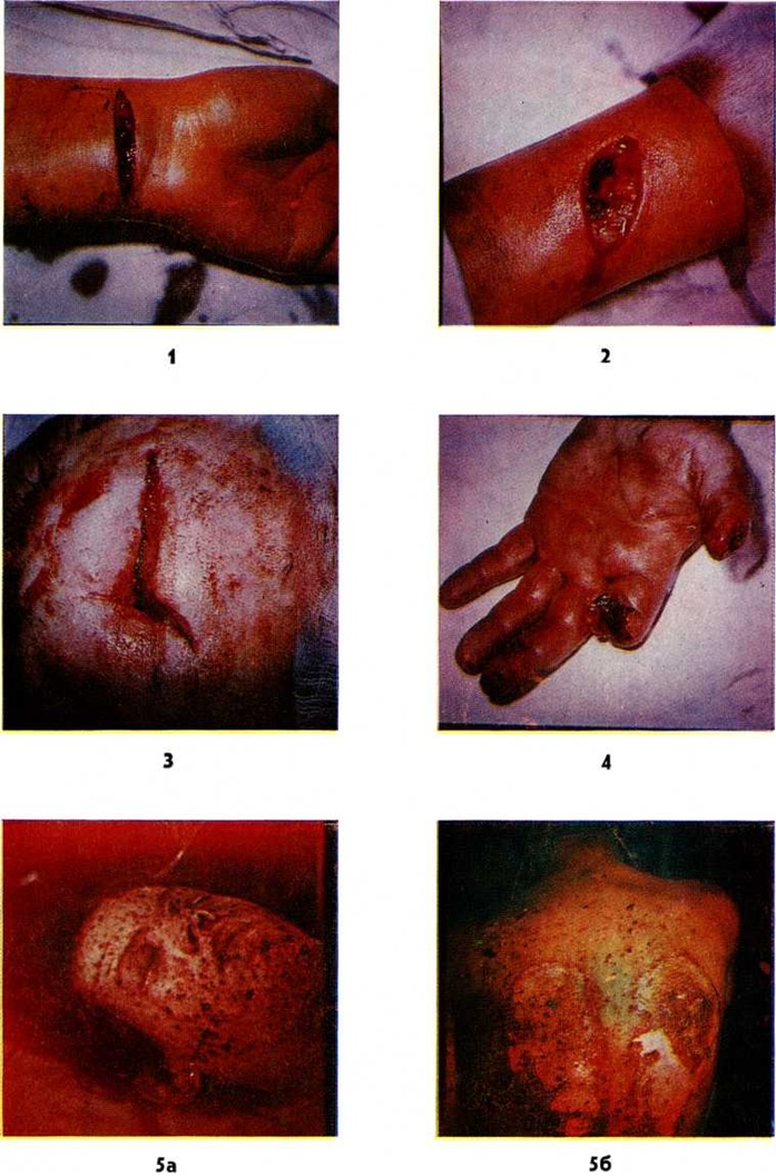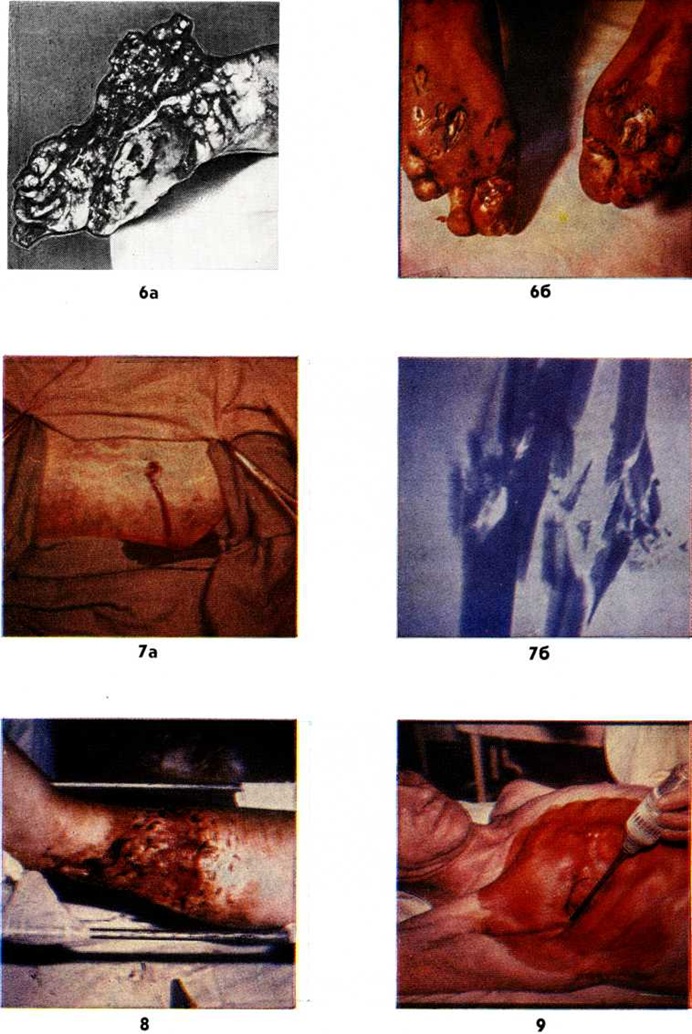 Ушибленная рана (цветной рисунок 3), возникающая от удара тупым предметом, как и размозжённая рана, при которой наблюдается раздавливание и разрыв тканей, имеют обширную зону первичного и особенно вторичного травматического некроза с обильным микробным загрязнением. Иногда под действием большой силы, вызывающей разрыв и размозжение тканей (рисунок 2,3), происходит полное отделение сегмента конечности, так называемый травматический отрыв (цветной рисунок 4), существенной особенностью к-рога является отрыв кожного покрова выше уровня разъединения глубжележащих тканей. Укушенная рана возникает вследствие укуса животным или человеком, отличается обильным микробным загрязнением и частыми инфекционные осложнениями. При укусе животным может произойти заражение вирусом бешенства (смотри полный свод знаний). Огнестрельные раны возникают в результате воздействия огнестрельного снаряда. При этом повреждение характеризуется сложной структурой, обширной зоной первичного и вторичного травматического некроза, развитием различных осложнений (смотри полный свод знаний: ниже «Особенности ранений военного времени. Этапное лечение»). Многообразие систем огнестрельного оружия и боеприпасов обусловливает большое разнообразие огнестрельных ран, при классификации которых, помимо морфологический признаков, свойственных всем ранам, учитывается и вид ранящего снаряда. Так, различают пулевые, осколочные ранения (цветной рисунок 5, 6) и ранения дробью (рисунок 4). Для огнестрельных ранений отдельных анатомических областей и органов тела (например, груди, живота, таза, суставов и другие) разработаны частные классификации. Кроме того, различают раны касательные, слепые и сквозные; проникающие и непроникающие; с повреждением и без повреждения внутренних органов; одиночные, множественные и сочетанные; асептические, гнойные инфицированные; отравленные; комбинированные. При касательном ранении образовавшийся раневой канал лишён одной стенки. При слепом ранении раневой канал не имеет выходного отверстия и заканчивается в тканях; при сквозном ранении имеются входное и выходное отверстия. Проникающим называется ранение, при котором ранящий предмет попадает в какую-либо полость человеческого тела (плевральную, брюшную, суставную, полость черепа, камеры глаза, придаточные пазухи носа и другие) при условии прободения им всей толщи стенки соответствующей полости, включая париетальный листок плевры, брюшины и другие Множественное ранение возникает при повреждении двух и более органов (областей тела), несколькими поражающими агентами одного и того же вида оружия (например, ранение верхней и нижней конечностей двумя пулями). При сочетанном ранении имеет место повреждение двух и более смежных анатомических областей или органов, обусловленное одиночным поражающим агентом (например, пулевое ранение желудка и селезёнки). При комбинированных ранениях рана возникает в результате действия механического фактора в различных комбинациях с другими поражающими факторами современного оружия — термическим, радиационным, химическим, бактериологическим. Учитывая поражение несколькими факторами, термин «комбинированные ранения» вышел из употребления и заменён соответствующим термином — комбинированные поражения (смотри полный свод знаний). К асеп