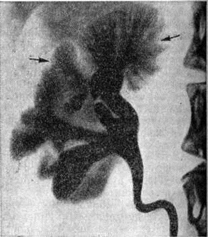 Тубулярный Рефлюкс на рентгенограмме имеет вид пучка, «метёлки» или «язычка пламени», исходящего из верхушки почечного сосочка и простирающегося в мозговое, а иногда и корковое вещество (рисунок 4). Лечение и профилактика лоханочно-почечного Рефлюкс сводятся к своевременному устранению обструкции мочевых путей и восстановлению нормальной уродинамики, в осторожном выполнении ретроградной уретеропиелографии, отказе от компрессии мочеточников при экскреторной урографии, тщательном лечении воспалительных заболеваний почек и мочевых путей. Пузырно-мочеточниковый, или пузырно-мочеточниково лоханочный, рефлюкс встречается чаще у детей, обычно связан с аномалиями развития или незавершённым созреванием пузырного устья мочеточников (смотри полный свод знаний) и нарушением проходимости нижних мочевых путей. Рефлюкс усиливается в момент мочеиспускания, когда повышается давление в мочевом пузыре (смотри полный свод знаний). Симптомами пузырно-мочеточниково-лоханочного рефлюкса являются боль в области почек в момент мочеиспускания, иногда двухтактное мочеиспускание, в запущенных случаях полиурия (смотри полный свод знаний), полидипсия (смотри полный свод знаний), изостенурия (смотри полный свод знаний), свидетельствующие о почечной недостаточности и необратимых ретенционных изменениях в почках и мочевых путях. Пузырно-мочеточниково лоханочный Рефлюкс выявляют с помощью рентгеноскопии или кинематоцистографии по спонтанному затеканию в мочеточники и почечные лоханки раствора контрастного вещества, введённого в мочевой пузырь. Активный Рефлюкс выявляют при проведении микционной цистографии (смотри полный свод знаний), кинематоцистографии, а также радиоизотопной реноцистографии. Пузырно-мочеточниковый Рефлюкс занимает ведущее место в урологический патологии детского возраста. Он выявляется в 25—30% случаев у детей с микробно-воспалительным процессом в мочевых путях. Предрасполагают к возникновению Рефлюкс короткий интрамуральный отдел мочеточников, более прямой угол его впадения в мочевой пузырь, незрелость замыкательного мышечного аппарата дистального отдела мочеточников, инфравезикальная обструкция, цистит, нарушения иннервации мочевых путей, удвоение мочеточника. При высоком Рефлюкс, достигающем почечных лоханок и канальцев почек (пиелотубулярный Рефлюкс), моча повреждающе действует на почечные канальцы и межуточную ткань почек, что приводит к дилатации и деструкции канальцев, дистрофическим изменениям нефротелия, развитию интерстициального нефрита с исходом в склероз. Эти процессы усугубляются при инфекции мочевых путей. В результате Рефлюкс задерживаются рост почек и совершенствование их функций; у детей старшего возраста возникает несоответствие между функциональными возможностями почек и потребностями организма ребёнка, что может проявиться нарушением отдельных почечных процессов и почечной недостаточностью. Согласно классификации Хейкеля и Парккулайнена (P. Е. Heikel, К. V. Parkkulainen, 1966), принятой в педиатрической практике, различают 5 степеней пузырно-мочеточникового Рефлюкс При I степени моча забрасывается до средней трети мочеточника, при II — до почечной лоханки, при III — IV степени — контрастное вещество заполняет чашечно-лоханочную систему, при IV степени отмечается пиелоэктазия и огрубен