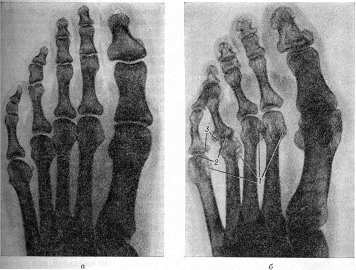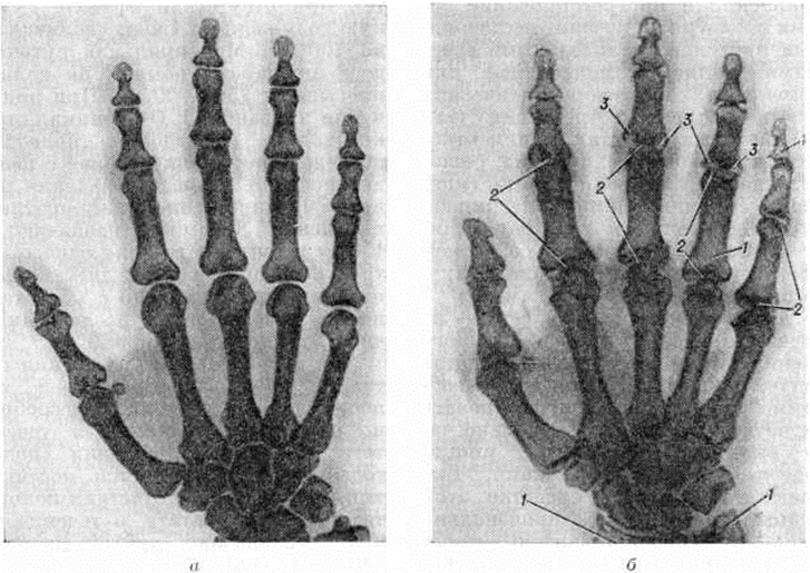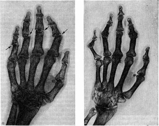 В дальнейшем присоединяется сужение суставных щелей, эрозии костей, подвывихи и вывихи (рисунок 7, 8). Часто на фоне описанных изменений на краях суставных поверхностей формируются остеофиты — проявление вторичного артроза. Тяжёлое ревматоидное поражение суставов может приводить к их анкилозированию; в случаях особо неблагоприятного течения возможен остеолиз ближайших к суставам отделов костей (рисунок 9). Как редкие рентгенологическое симптомы встречаются периоститы (смотри полный свод знаний), асептические остеонекрозы (смотри полный свод знаний: Остеохондропатия). На основании рентгенологическое изменений суставов выделяют стадии Ревматоидный артрит Из многочисленных схем наиболее известна схема Стайнброккера, согласно которой выделяют 4 стадии ревматоидного артрита. К 1-й стадии относят случаи с околосуставным остеопорозом (смотри полный свод знаний), но без сужения суставных щелей и эрозии костей. Если к остеопорозу присоединяется сужение суставных щелей, то это соответствует 2-й стадии. Наличие эрозий костей указывает на 3-ю стадию, а костного анкилоза — на 4-ю стадию. Ларсен (A. Larsen, 1974) предложил более детализированную оценку, выделив 6 стадий, и дал для каждого сустава отдельную схему, отражающую местные особенности проявлений Ревматоидный артрит Дифференциальная диагностика представляет трудности обычно лишь на ранних стадиях ; Ревматоидный артрит при отсутствии рентгенологическое признаков эрозивного артрита и ревматоидных факторов в сыворотке крови. Чаще всего дифференциальный диагноз проводят с некоторыми вариантами таких заболеваний, как болезнь Бехтерева, болезнь Рейтера, псориатический артрит, остеоартроз, подагра (смотри полный свод знаний). Поражение периферических суставов при болезни Бехтерева (смотри полный свод знаний: Бехтерева болезнь) в ряде случаев, однако, слабовыраженные (требующие целенаправленного поиска) или кратковременные. Поражение суставов при псориатическом артрите (смотри полный свод знаний: Артриты), как правило, отличается от Ревматоидный артрит несимметричностью, наличием периартикулярного отёка, вовлечением в процесс дистальных межфаланговых суставов кистей. Важное значение имеет обнаружение типичных изменении кожи. Однако они могут быть непостоянными, небольшими по размерам и локализоваться, например, только на волосистой части головы или ногтях, что при недостаточно внимательном осмотре может привести к диагностической ошибке. Вторичный синовит при деформирующем остеоартрозе (смотри полный свод знаний: Артрозы) с преимущественным поражением суставов кистей отличается от Ревматоидный артрит тем, что возникает только в тех суставах, которые наиболее часто вовлекаются в процесс именно при остеоартрозе (дистальных, реже проксимальных межфаланговых), и практически не встречается в пястно-фаланговых суставах, как правило страдающих Ревматоидный артрит, а также отсутствием ревматоидных факторов. Лечение. Существует большое количество различных методов лечения Ревматоидный артрит, выбор которых зависит от формы болезни, степени её активности, течения, характера изменений суставов, внесуставных проявлений и других факторов. Основное значение в лечении имеют лекарственные средства. При отсутствии клинические, признаков внесуставных проявлений лечение, как