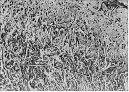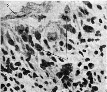 Патологическая анатомия. Для Ревматоидный артрит характерно вовлечение в патологический процесс многих органов и систем, но преимущественно поражаются суставы. В основе тканевых повреждений при этом заболевании лежит иммунное воспаление, выражающееся в форме гиперчувствительности немедленного и замедленного типа. Включение факторов гуморальной аллергии (смотри полный свод знаний) подтверждается признаками резкого усиления сосудистой проницаемости, присутствием в участках поражения иммуноглобулинов и комплемента, полиморфно-ядерных лейкоцитов, плазмобластов, пролиферативно-деструктивным характером васкулита. Морфологически выражением клеточной гиперчувствительности является наличие большого числа бластных форм Т-лимфоцитов (смотри полный свод знаний: И мму некомпетентные клетки) и макрофагов (смотри полный свод знаний) с признаками интенсивно протекающего фагоцитоза (смотри полный свод знаний) в поражённых тканях. В развитии тканевых и органных повреждений при Ревматоидный артрит ведущую роль играют микроциркуляторные нарушения и лизосомные ферменты. В суставах при развёрнутой клинические, картине заболевания обнаруживается ворсинчатое разрастание синовиальной оболочки (рисунок 1), в части случаев наползающей в виде паннуса на поверхность суставного хряща. При этом в суставном хряще определяются эрозии, трещины, щели; его остатки сухие и зернистые на вид. В суставных полостях обнаруживается увеличенное количество вязкой мутной синовиальной жидкости, постоянно отмечается утолщение и склероз суставной капсулы, имеются фиброзные спайки. Полная облитерация суставной полости спайками ведёт к развитию фиброзного анкилоза (смотри полный свод знаний). Пролиферация остеоидной ткани сопровождается развитием остеофитов (смотри полный свод знаний) и костных анкилозов. В гистологический картине синовита выделяют следующие изменения: 1) поражение сосудов микроциркуляторного русла; 2) гиперплазию и гипертрофию синовиальных клеток; 3) воспалительную клеточную инфильтрацию; 4) разрастание грануляционной ткани, склероз, липоматоз синовиальной собственной пластинки. Повышается проницаемость стенок сосудов микроциркуляторного русла, сопровождающаяся выходом фибринозного экссудата и образованием очагов фибриноида в синовиальной собственной пластинке и фибриноподобных наложений на поверхности синовиальной оболочки. Иммуноморфологически в очагах фибриноида и в фибриноподобных наложениях выявляются фибрин, иммуноглобулины (G, А, М) и С3-фракция комплемента. При обострении воспаления постоянно отмечается продуктивный или продуктивно-деструктивный васкулит с фиксацией в сосудистой стенке иммуноглобулинов и комплемента. В глубоких слоях синовиальной оболочки (смотри полный свод знаний) изредка определяются ревматоидные узелки — небольшие участки фибриноидного некроза, окружённые макрофагами и лимфоцитами. В 80% случаев встречается гиперплазия и гипертрофия синовиоцитов с характерным палисадообразным их расположением (рисунок 2). С помощью электронно-микроскопического исследования обнаружено, что гипертрофия синовиоцитов происходит за счёт гиперплазии их органелл, особенно зернистой эндоплазматической сети, полисом, аппарата Гольджи и лизосом (рисунок 3). В гиперплазии ворсинчатого слоя синовиал