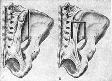 При начальных проявлениях гнойного Сакроилеит производят неотложное вскрытие гнойных затёков и резекцию прилежащих участков крестца или таза (смотри полный свод знаний: Крестцово-подвздошный сустав). При хронический банальном Сакроилеит с большими изменениями в суставе в плановом порядке выполняют его резекцию по Барденгейеру — удаление заднего отдела крыла подвздошной кости и резекцию суставной поверхности крестца (рисунок, а). При туберкулёзном Сакроилеит с частой локализацией очага деструкции в нижней части сустава показана экономная резекция сустава по Покотилову (рисунок, б): П-образное иссечение нижней части сустава с дополнительным выскабливанием прилежащих изменённых участков костей. Эта операция не нарушает непрерывность тазового кольца, после неё проводят длительную антибактериальную терапию.