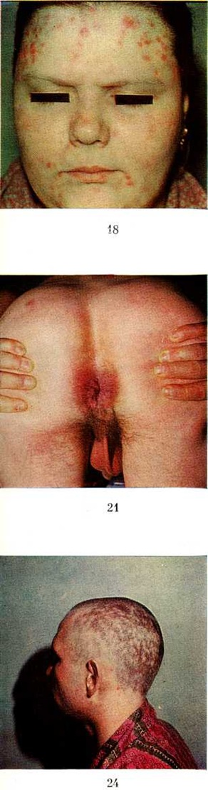 При разлитом милиарном гуммозном гепатите в печени появляются в большом количестве мелкие гуммозные очажки или происходит разрастание диффузного гуммозного инфильтрата (в случае сочетания с интерстициальным процессом). Затем инфильтрат замещается рубцовой тканью и развивается цирроз печени. При этом отмечают уплотнение и болезненность печени, а также увеличение селезёнки, в последующем происходит уменьшение размеров печени, она становится бугристой. Специфическое лечение может дать эффект только в начале заболевания. Хронический эпителиальный гепатит сопровождается общим недомоганием, плохим аппетитом, слабостью, кожным зудом, желтухой. Печень увеличена, вначале безболезненна, гладкая. В крови отмечается анемия, лейкопения и гиперхромия. Функциональные пробы выявляют нарушение деятельности печени. Затем она становится плотной, уменьшается в размерах, появляется асцит (смотри полный свод знаний). Смерть наступает от печёночной недостаточности (смотри полный свод знаний). Поражение желудка при позднем Сифилис характеризуется образованием ограниченных узлов или разлитой гуммозной инфильтрации и сопровождается такими же симптомами, как при новообразованиях желудка (смотри полный свод знаний). Распад гуммы похож на распад раковой опухоли желудка и может вызвать кровотечения или перфорацию стенки с последующим перитонитом. Гуммозный инфильтрат может замещаться рубцовой тканью, что приводит к деформациям желудка (двухполостной, многополостной желудок) или к его диффузному фиброзному сморщиванию. В постановке диагноза помогают результаты серологический реакций, особенно РИБТ и РИФ (смотри полный свод знаний: Иммунофлюоресценция), а также специфического лечения, которое эффективно в начальных стадиях болезни (до образования рубцовых изменений). Поражения пищевода (смотри полный свод знаний) и кишечника (смотри полный свод знаний: Прямая кишка) встречаются редко. Развиваются как диффузные, так и ограниченные гуммозные процессы. При распаде гумм образуются язвы с последующим рубцеванием, приводящим к стенозам пищевода или кишечника. Поражения селезёнки обычно сочетаются с поражениями печени — гепатолиенальный синдром (смотри полный свод знаний). Исключительно редко наблюдаются изолированные гуммозные сплениты или диффузный интерстициальный сифилитический спленит. Поражения почек (смотри полный свод знаний) могут проявиться в виде липоидного нефроза (чаще при раннем Сифилис), амилоидоза почки (смотри полный свод знаний: Амилоидоз), протекающего по типу амилоидного нефроза, нефросклероза, приводящего к развитию сморщенной почки. В ряде случаев могут образовываться изолированные гуммы (в корковом веществе) или возникает разлитая гуммозная инфильтрация. При этих процессах появляются отеки, в моче — белок, кровь, цилиндры, а при изолированных гуммах — приступообразные боли в области поясницы. Склеротический процесс в почке приводит к повышению АД, гипертрофии левого желудочка сердца, появлению акцента II тона на аорте, нарушению водного обмена и увеличению количества остаточного азота. Чем раньше начата специфическая терапия, тем благоприятнее результаты. Крайне редко встречаются при позднем Сифилис поражения лёгких, которые проявляются гуммозной (рисунок 3, в) и склеротической формами (смотри полный 