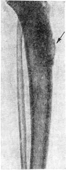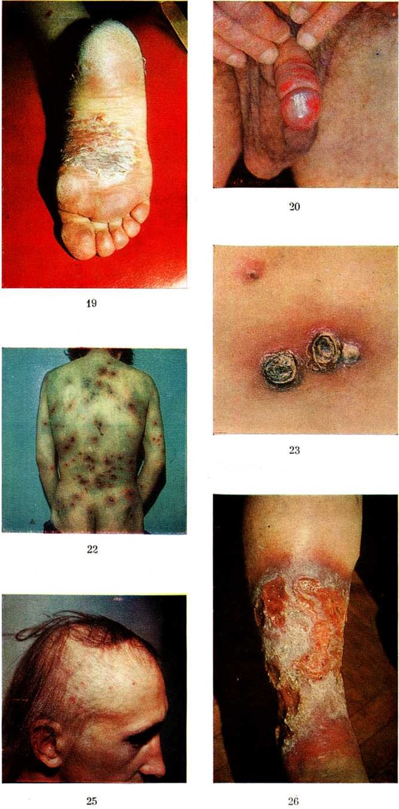Плоские кости черепа, грудина вовлекаются в процесс в 5% случаев всех костных сифилитических поражений. Наиболее часто поражаются лобные и теменные кости черепа. При этом наблюдаются преимущественно деструктивные гуммозные процессы. Характерны случаи, при которых процесс ограничивается разрушением только наружной пластинки кости. Довольно быстро дефект кости замещается реактивно образующимися костными массами и периостальными наслоениями, менее мощными и плотными, чем в области длинных трубчатых костей. Гуммозные разрушения костей черепа могут в ряде случаев сопровождаться поражением мягких тканей. При этом они размягчаются, изъязвляются, в них образуются, в отличие от туберкулёзного остеомиелита, широкие поверхностные свищи. Поражение костей носа и твёрдого неба происходит обычно вследствие перехода процесса со слизистых оболочек, то есть имеет место вторичный костный процесс. Сифилитические спондилиты встречаются редко, в 2—6% случаев. Преимущественно поражается тело одного, реже двух-трёх позвонков, как правило, в шейном отделе позвоночника. При этом развивается неподвижность поражённого отдела, а также наблюдаются непостоянные самопроизвольно возникающие боли. В постановке диагноза помогают данные клинические картины (относительная лёгкость течения), рентгенологической картины (отсутствие тени натечника, чёткая очерченность очагов деструкции, сохранение межпозвоночных дисков), серологические исследования крови и результаты пробного противосифилитического лечения. Дифференциальную диагностику проводят с неспецифическим остеомиелитом, туберкулёзом костей, в том числе туберкулёзным спондилитом (смотри полный свод знаний), костной саркомой (смотри полный свод знаний: Остеогенная саркома), деформирующим оститом (смотри полный свод знаний: Педжета болезнь), метастатическими поражениями при злокачественных опухолях (смотри полный свод знаний: Позвоночник). Поражения суставов при позднем Сифилис встречаются реже, чем поражения костей. По классификации Н. А. Вельяминова, различают первично-синовиальные и первично-костные артриты (смотри полный свод знаний: Остеоартрит). Первично-синовиальные артриты бывают острыми и хроническими. К острым формам относятся так называемый реактивные артриты (смотри полный свод знаний), возникающие под влиянием гуммозного процесса, близко расположенного к суставу (в эпифизе, метафизе). Однако чаще наблюдаются хронический синовиальные артриты (синовиты Клетона), возникновение которых связывают с активизацией латентно протекающей инфекции. Они проявляются болями, шаровидной припухлостью сустава и внутрисуставным выпотом, с незначительным нарушением функции сустава. Отмечается двусторонность поражения. Рентгенологически изменений в суставе не обнаруживают. Гуммозные синовиты встречаются редко. Первично-костные артриты (остеоартриты) возникают вследствие гуммозных поражений эпифизов костей (гуммозные эпифизиты). Рентгенологически в эпифизах определяются круглые сотовидные дефекты с маловыраженной склеротической реакцией в окружности. Характерно несоответствие между обширными разрушениями костей сустава, выявляемыми на рентгенограмме, и хорошим общим состоянием больного. Наиболее часто поражаются коленные, плечевые, локтевые и голеностопные суставы, ко