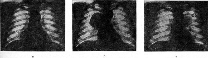 Поздние сифилитические поражения сердечно-сосудистой системы (кардиоваскулярный Сифилис) выявляются у 0,25—0,96% терапевтических больных, из них в 93,4% случаев, по данным Мюнтаню (М. Munteanu, 1973), регистрируется мезаортит. Однако прижизненная его диагностика, как отмечает Блумгарт (Н. L. Blumgart, 1940), составляет лишь 10% случаев, так как у большинства этих больных серологические реакции отрицательные, а РИБТ и РИФ ставятся редко. Поздние сифилитические миокардиты проявляются образованием гумм или хронический межуточного миокардита, часто называемого гуммозным миокардитом. Гуммы сердца встречаются крайне редко (рисунок 3, а) и в связи с малой величиной могут протекать бессимптомно. Иногда отмечаются одышка, общая слабость, быстрая утомляемость, боли в области сердца. После замещения гуммы фиброзной тканью может нарушаться проводящая система сердца (чаще в области желудочков), что приводит к нарушению сердечного ритма. Гуммозный миокардит может также сопровождаться синюшностью кожи (особенно конечностей), расширением границ сердца, глухостью I тона, систолическим шумом на верхушке сердца, нарушением ритма. От других форм кардиоваскулярного Сифилис он отличается, как правило, позитивными результатами серологических реакций. При поздно начатом лечении его исход — диффузный или очаговый кардиосклероз (смотри полный свод знаний). Неосложнённый сифилитический аортит — самое частое проявление висцерального Сифилис (смотри полный свод знаний: Аортит). Он чаще наблюдается у мужчин, чем у женщин. При заболевании происходит уплотнение стенок аорты и расширение её восходящей части до 5—6 сантиметров (3—3,5 сантиметров в норме). Реже в процесс вовлекается дуга аорты или её нисходящая часть и крайне редко — её брюшная часть. Нередко заболевание диагностируется при рентгенологическое обследовании по характерному ограниченному расширению аорты и наличию участков кальцификации, располагающихся продольно в стенках восходящей части в виде линейных пятен. Объективно отмечается мягкий, дующий, нерезко выраженный систолический шум на аорте, акцент II тона на аорте с металлическим оттенком (звенящий тон), в крови лимфоцитез, эозинофилия, умеренное повышение РОЭ. Больные могут жаловаться на одышку, общую слабость, сердцебиение, боли в области сердца, за грудиной (аорталгия) и чувство сдавления. К сифилитическому аортиту нередко присоединяются артериосклеротические изменения, затрудняя его распознавание. По данным различных исследователей, в 22— 26% случаев он сочетается с симптомами нейросифилиса и в 56% — с поздним асимптомным сифилитическим менингитом; у 84% больных серологические реакции бывают отрицательными, РИБТ положительна в 100% случаев. Сифилитический аортит может осложняться стенозом устьев (чаще правого) коронарных (венечных артерий, недостаточностью клапана аорты, аневризмой аорты (смотри полный свод знаний). В отличие от атеросклероза (смотри полный свод знаний) сифилитические изменения не распространяются по ходу коронарных сосудов, а ограничиваются их начальными участками, приводя к стенозу, что может (вследствие коронароспазмов) приводить к острой или хронической коронарной недостаточности (смотри полный свод знаний) и послужить причиной трансмурального инфаркта миокарда (смотри полный свод знаний). Клинически развивается карт