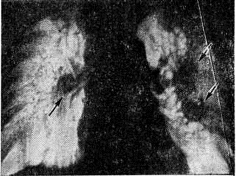 I стадия узелковой формы Силикоз характеризуется наличием на фоне интерстициального фиброза лёгких небольшого количества узелков (кодовое обозначение: р — 1,2; q — 1; грамм — 1), а I стадия при интерстициальной форме — умеренным двусторонним диффузным усилением лёгочного рисунка с видимыми линейно-сетчатыми и линейно-тяжистыми изменениями (s — 1,2; t — 1,2; u — 1,2). Рентгенологические признаки, определяющие переход процесса во II стадию, в основном обусловливаются усилением интерстициального и узелкового фиброза лёгких. При II стадии узелковой формы лёгочный рисунок плохо дифференцируется, видны многочисленные симметричные и равномерно расположенные мелко или средне-узелковые тени (р — 3; q — 3, грамм — 3). Силикоз II стадии при интерстициальной форме отличается большой густотой расположения линейно-сетчатых и грубо-тяжистых теней на единицу площади при более выраженном усилении и появлении деформации лёгочного рисунка (s — 3, t — 3, u — 3). Одновременно в большинстве случаев определяются также мелкие неправильной формы очажково-узелковые затемнения; III, или конечная, стадия узелкового или интерстициального Силикоз характеризуется увеличением количества фиброзных узелков, их слиянием, формированием теней массивного фиброза (А, В, С). Больные Силикоз, как правило, предъявляют мало жалоб. Чаще всего они отмечают умеренную одышку, кашель (сухой и с мокротой) и боль в груди. Клинические, проявления Силикоз нарастают по мере развития фиброзного процесса в лёгких, но полный параллелизм с рентгенологическое картиной отсутствует. Кашель и одышка при Силикоз могут быть связаны не только с выраженностью фиброза, но зависят также и от степени сопутствующего силикозу бронхита (смотри полный свод знаний), который носит преимущественно атрофический характер. Общее состояние больных довольно долго может оставаться удовлетворительным. Грудная клетка чаще обычной формы, но по мере нарастания эмфиземы лёгких расширяется с увеличением её переднезадних размеров. Типично жёсткое дыхание, иногда выслушиваются непостоянные сухие хрипы, реже в нижних отделах мелкопузырчатые хрипы и шум трения плевры. В III стадии силикоза могут обнаруживаться участки укорочения перкуторного звука и жёсткого дыхания бронхиального оттенка. По мере прогрессирования болезни может развиваться картина лёгочного сердца (смотри полный свод знаний). Клинические, анализ крови при Силикоз чаще без особых отклонений. Из биохимический исследований наибольшее значение имеет анализ крови на белковые фракции; прогрессирование Силикоз может сопровождаться гипергаммаглобулинемией. Функция дыхания чаще изменена нерезко, в начале болезни возможны умеренные обструктивные нарушения, на которые по мере прогрессирования процесса обычно наслаиваются рестриктивные. Течение Силикоз прогрессирующее, при этом развитие фиброза происходит в разные сроки. Различают Силикоз медленно прогрессирующий, остающийся на одном уровне иногда десятилетиями (чаще интерстициальный); быстро прогрессирующий — ухудшение состояния может произойти за 7—8 лет и быстрее; так называемый поздний Силикоз— развивающийся спустя многие годы после имевшего место контакта с пылью. В прошлом были описаны случаи острого Силикоз при особо неблагоприятных условиях труда, когда болезнь развивалась быстро и п