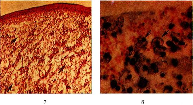 В клетках Микулича, а иногда и вне их при применении специальных окрасок выявляется палочка Волковича —Фриша (цветной рисунок 8). Эозинофильные и нейтрофильные лейкоциты (гранулоциты) присутствуют в относительно небольшом количестве. Характерно наличие в специфической грануляционной ткани так называемый русселевских телец, известных также как гиалиновые тельца Пеллиццари и Корниля. Большинство исследователей связывают происхождение клеток Микулича с присутствием в моноцитарных макрофагах палочек Волковича—Фриша. С помощью электронной микроскопии (смотри полный свод знаний) в цитоплазме фагосом клеток Микулича обнаружены палочки Волковича—Фриша как интактные, так и находящиеся на разных стадиях переваривания. Наличие пенистой цитоплазмы клетки Микулича объясняют накоплением в фагосомах непереваренных бактериальных гликозаминогликанов, которые, повышая осмотическое давление, способствуют вакуолизации и разрыву фагосом. Эпителий над склеромными грануляциями в различной степени инфильтрирован нейтрофильными лейкоцитами. В клетках эпителия отмечаются признаки вакуольной дистрофии (смотри полный свод знаний), сосочковый слой кожи сглажен, подвергается атрофии, которая наблюдается также в сальных и потовых железах, фолликулах волос. Цилиндрический мерцательный эпителий слизистых оболочек замещается многослойным плоским, иногда с патологический ороговением типа гиперкератоза (смотри полный свод знаний: Кератозы) и паракератоза (смотри полный свод знаний), образует акантотические погружения в специфическую грануляционную ткань, иногда с атипическими реактивными разрастаниями. Над крупными бугристыми узлами может наблюдаться истончение эпителиального покрова до 2—3 рядов уплощённых клеток. Существенное место в развитии склеромных поражений занимают явления склероза (смотри полный свод знаний), обусловленного ростом и созреванием специфической грануляционной ткани. Образование коллагеновых волокон в виде пучков начинается в глубоких отделах склеромных грануляций и идёт по направлению к поверхности. При этом грануляционная ткань разделяется на отдельные островки, охваченные грубыми, нередко гиалинизированными пучками коллагена (смотри полный свод знаний). Наряду с этим отмечается новообразование эластических волокон. Исчезновение специфической грануляционной ткани при лечении стрептомицином также связано с усилением склерозирования, при этом в первую очередь наблюдается уменьшение количества, а затем исчезновение в грануляционной ткани клеток Микулича. При длительном течении Склерома специфические морфологический изменения иногда наблюдаются в регионарных лимфатических, узлах. Во внутренних органах каких-либо специфических проявлений склеромы не обнаружено. Клиническая картина. Склерома протекает годами и десятилетиями. Инкубационный период длится несколько лет. Большинство больных заболевают в возрасте 15—20 лет, встречаются случаи заболевания и в детском возрасте. В течении Склерома выделяют три периода: доклинический, в котором выявляются положительные результаты серологический исследований, но ещё отсутствуют клинические, проявления; клинический, характеризующийся явными клинические, проявлениями и положительными серологический реакциями; резидуальный, в котором набл