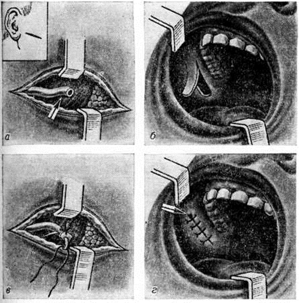 Для устранения полных наружных свищей околоушного протока проводят более сложные реконструктивные операции. При достаточной длине оставшегося околоушного протока устье свища выделяют окаймляющими разрезами на коже щеки и через ткани щеки проводят околоушный проток в полость рта, подшивая его к краям рассечённой слизистой оболочки. При невозможности проведения данной операции наиболее радикальной и надёжной является пластика периферической части протока по методу, предложенному Г. А. Васильевым. Окаймляющим разрезом иссекают устье Слюнные свищи на коже щеки, отпрепаровывают околоушный проток с учётом топографии ветвей лицевого нерва (рисунок, а). Далее соответственно переднему краю жевательной мышцы на слизистой оболочке щеки выкраивают языкообразный лоскут с основанием, обращённым кпереди (рисунок, б). Затем свободный край лоскута проводят сквозь рассечённые ткани щеки и подшивают его к краям центрального участка ранее выделенного околоушного протока (рисунок, в). Таким образом из тканей слизистой оболочки щеки формируют проток околоушной железы с устьем у основания лоскута (рисунок, г).
