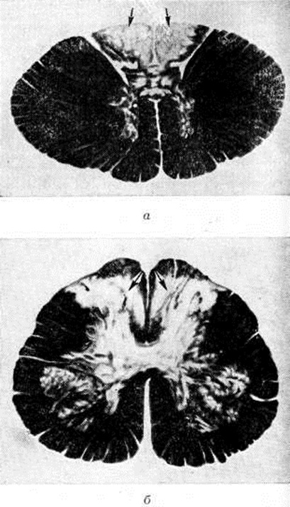 До настоящий, времени отсутствует единое мнение относительно провоцирующей роли травм, интоксикаций (как правило, алкогольной), соматической отягощенности, длительных хронический инфекций в развитии Спинная сухотка у больных сифилисом. Патологическая анатомия. Макроскопически спинной мозг (смотри полный свод знаний) уплощен и истончен, его задние канатики и задние корешки спинномозговых нервов истончены и сморщены. Микроскопически в начальной стадии Спинная сухотка выявляют лептоменингит (смотри полный свод знаний: Менингит) вокруг интрадуральной части задних корешков и в области задних канатиков с инфильтрацией лимфоцитами и плазматическими клетками, а также пролиферативные изменения в стенках сосудов, соединительной ткани, в пери и эндоневрии задних корешков. Описанные выше изменения более отчетливы в нижних отделах спинного мозга — крестцовом и поясничном. В стадии выраженной Спинная сухотка поражение характеризуется дегенерацией центральных отростков клеток спинномозговых узлов, при этом сами узлы обычно мало изменены. Особенно значительные дегенеративные изменения отмечают в экстрадуральной части задних корешков и в зоне их вступления в спинной мозг, где они сдавливаются фиброзно-утолщенными оболочками и разросшейся краевой глией (смотри полный свод знаний: Нейроглия). Дегенеративные изменения (распад миелиновой оболочки и осевых цилиндров аксонов, образующих задние канатики) волокон корешков распространяются вверх по задним канатикам спинного мозга. В заключительной стадии процесса на месте атрофированных волокон задних корешков и канатиков разрастается фибриллярная глия pi соединительная ткань. В поясничном и крестцовом отделах спинного мозга распад миелина начинается в медиальной части задних канатиков. В грудных и шейных сегментах спинного мозга дегенерации подвергается вся область задних канатиков (рисунок 1). Её обнаруживают и в периферических отростках клеток спинномозговых узлов, входящих в состав образований периферической нервной системы (сплетений, нервов), а также в различных отделах высшая нервная система Во многих случаях выявляют дегенерацию волокон черепно-мозговых (черепных) нервов в их внутричерепном отрезке. На разных стадиях Спинная сухотка могут обнаруживаться инфильтративные, пролиферативные и рубцовые изменения в оболочках головного мозга, а также поражение сосудов мозговых оболочек.
