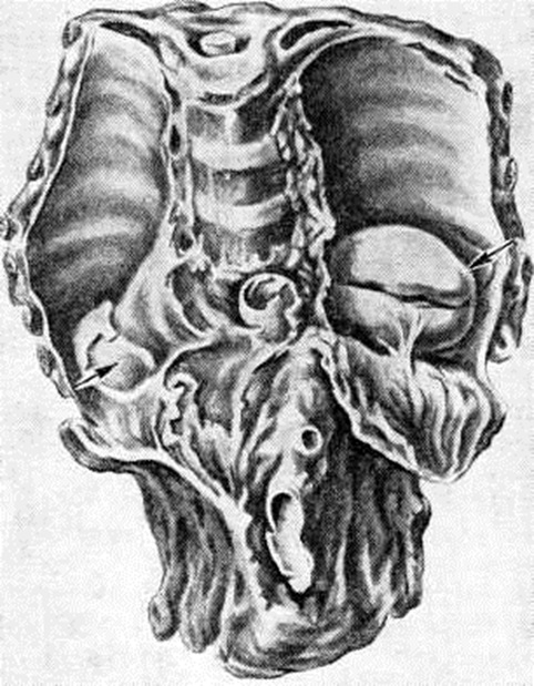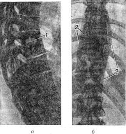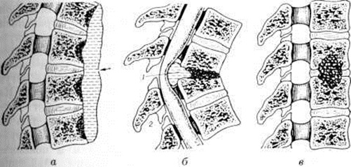 Образующиеся в результате воспаления некротические массы (казеоз) заполняют очаг деструкции в теле позвонка. Прогрессирование туберкулёзного процесса приводит к разрушению компактного вещества тела позвонка и распространению туберкулёзного процесса за его пределы. При этом в мягких тканях могут образовываться холодные (натечные) абсцессы (смотри полный свод знаний: Натечник). Возможны различные пути распространения туберкулёзного процесса из первичного очага через переднюю, заднюю и боковую поверхности тела позвонка (внедисковый путь), а также через межпозвоночный диск (внутридисковый путь). Процесс, распространяющийся внедисковым путем, приводит к обширным разрушениям позвонков. Прорываясь через переднюю поверхность тела позвонка, гной отслаивает переднюю продольную связку, распространяется под ней, образуя превертебральный абсцесс (рисунок 1, а), и вызывает контактное поражение других позвонков, так называемый поверхностную костоеду. Превертебральные абсцессы в зависимости от направления распространения гноя вызывают восходящий или нисходящий периостит (смотри полный свод знаний). При прорыве очага под заднюю продольную связку обычно возникают неврологический нарушения, обусловленные отёком спинного мозга (смотри полный свод знаний), сдавлением его гноем (рисунок 1, б), секвестрами, выступающими кзади остатками разрушенных позвонков, так называемый клином Урбана, утолщением мозговых оболочек вследствие пахименингита (смотри полный свод знаний). Характер неврологический нарушений определяется локализацией процесса и механизмом сдавления спинного мозга. При прорыве гноя через боковые поверхности тела позвонка образуются паравертебральные абсцессы, которые распространяются преимущественно в стороны от позвоночника и потому в меньшей степени контактно поражают тела соседних позвонков. В грудном отделе позвоночника такие абсцессы могут принимать форму веретена, полушарий, чечевицы, шаров, или так называемый ласточкиных гнезд (рисунок 2). В нижележащих отделах — нижнем грудном, поясничном и пояснично-крестцовом — абсцессы распространяются по мышцам, прикрепляющимся к пораженным позвонкам. Так, из поясничного отдела гной может распространяться в подвздошную область и далее — через мышечную лакуну на бедро. Из пояснично-крестцового отдела наиболее типичный путь распространения по ходу грушевидных мышц в ягодичную область. При внутридисковом пути процесс распространяется вертикально в направлении межпозвоночного диска, затем вовлекается студенистое ядро, а через него контактно — соседний позвонок (рисунок 1, в). Внутридисковое распространение гноя в большинстве случаев сочетается с малой деструкцией позвонков и наклонностью к отграничению процесса. В ряде случаев абсцессы прорываются с образованием наружных или внутренних свищей (смотри полный свод знаний). Через свищи происходит опорожнение абсцессов и очагов деструкции, что временно уменьшает явления интоксикации. Однако образование свищей чревато присоединением вторичной инфекции, что значительно осложняет лечение и прогноз. Длительно существующие свищи, особенно имеющие длинный извитой свищевой ход с затеками (смотри полный свод знаний), сравнительно быстро ведут к развитию амилоидоза (смотри полный свод знаний) внутренних органо