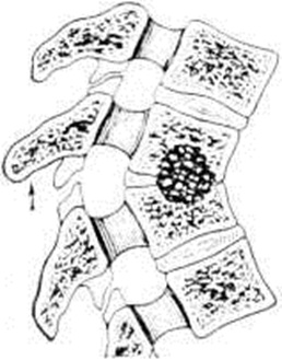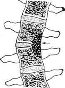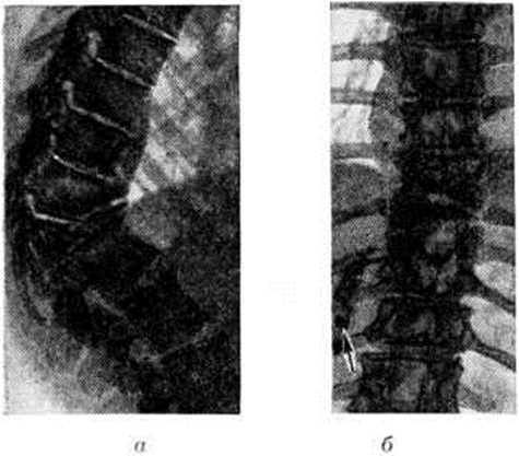 Клиническая картин а. Согласно данным П. Г. Корнева, в развитии туберкулёзного Спондилит можно выделить преспондилитическую, спондилитическую и постспондилитическую фазы развития. Преспондилитическая фаза, связанная с возникновением и развитием патологический процесса в пределах одного позвонка, характеризуется неопределенными клинические, проявлениями. В этой фазе преобладают симптомы, характерные для начальных стадий туберкулёза (смотри полный свод знаний) любой локализации (слабость, субфебрильная температура, вегетативные нарушения и другие). Местная симптоматика состоит в ощущении некоторой неловкости, скованности в пораженном сегменте позвоночника. Больные в этот период болезни за помощью обращаются редко. Спондилитическая фаза в связи с распространением процесса за пределы одного позвонка характеризуется прогрессированием проявлений, четкостью и определенностью симптоматики. В этой фазе выделяют стадии начала, разгара и затихания. Боль концентрируется в одном участке позвоночника, хотя может иррадиировать по ходу периферических нервов, что нередко симулирует радикулит, неврит, а также различную патологию внутренних органов. В стадии разгара боль достигает большой интенсивности, усиливаясь при нагрузке на позвоночник. Характерно её заметное уменьшение или исчезновение при разгрузке позвоночника (назначении больному постельного режима, особенно при укладке его в гипсовую кроватку). Искривление позвоночника при Спондилит в виде углообразной кифотической деформации обусловлено разрушением тел позвонков, их компрессионным переломом и клиновидной деформацией. При компрессии одного — двух тел позвонков остистый отросток поднимается кверху и выпячивается, образуя «точечный» горб (рисунок 4). При распространении процесса кифотическая деформация увеличивается. В шейном и поясничном отделах горб обычно невелик или отсутствует полностью, и деформация позвоночника чаще проявляется сглаженностью лордоза (смотри полный свод знаний). При патологический процессе в грудном, а особенно в поясничном отделе позвоночника туловище больного укорачивается, вследствие чего возникает диспропорция между туловищем и конечностями. По мере затихания процесса прогрессирование деформации замедляется, а затем прекращается. Одновременно улучшается общее состояние больных. В стадии затихания боли обычно отсутствуют, хотя может оставаться болезненность позвоночника, обусловленная его деформацией, нарушением опороспособности, патологический подвижностью, компрессией корешков спинномозговых нервов. Постспондилитическая фаза характеризуется относительно благополучным состоянием больных. Однако могут оставаться корешковые боли, явления нестабильности позвоночника, его искривление. У детей пораженные позвонки отстают в росте, что усугубляет диспропорцию между туловищем и конечностями. В этой фазе периодически могут возникать обострения патологический процесса, вызванные активизацией отграниченных, не ликвидированных очагов и абсцессов; при этом развиваются клинические, признаки, характерные для активного туберкулёзного процесса, прогрессируют анатомо-функциональные нарушения. Неврологический нарушения при Спондилит, особенно корешковые, наблюдаются сравнительно часто (примерно у 10—17% больных Спо