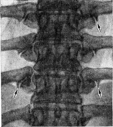 Диагноз Спондилоартроз ставят главным образом на основании клиники и данных рентгенологического исследования. На рентгенограммах определяется сужение суставных щелей, субхондральный остеосклероз (смотри полный свод знаний), краевые костные разрастания (рисунок), продолжающие суставные поверхности, удлинение и деформация суставных отростков.
