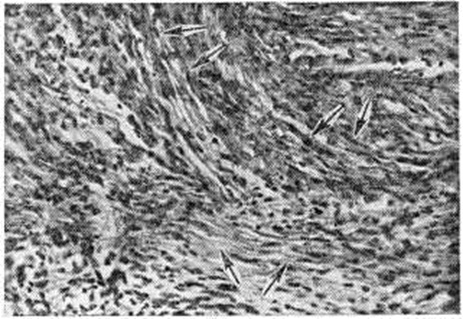 По своей гистологический структуре Спонгиобластома полярная может быть похожа на веретенообразно-клеточную саркому. В дифференциальной морфологический диагностике этих опухолей помогает импрегнация по методу Рамон-и-Кахаля (смотри полный свод знаний: Рамон-и-Кахаля методы), а также импрегнация серебром (смотри полный свод знаний: Серебрения методы).