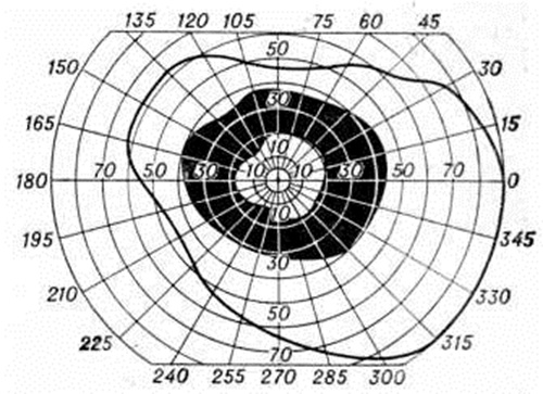 Первым симптомом пигментной дистрофии сетчатки является понижение зрения в темноте (смотри полный свод знаний: Гемералопия), позже появляются дефекты поля зрения (смотри полный свод знаний: Скотома), снижение остроты зрения (смотри полный свод знаний), изменения глазного дна (смотри полный свод знаний). Характерным дефектом поля зрения (смотри полный свод знаний) является кольцевидная скотома (рисунок 1), которая при прогрессировании заболевания распространяется как к центру, так и к периферии поля зрения и приводит к его концентрическому сужению (трубчатое, или туннельное, поле зрения). При этом, несмотря на относительно высокое центральное зрение, которое может сохраняться много лет, резкое нарушение ориентации приводит к инвалидизации. Иногда при исследовании поля зрения выявляют центральную (при центральной форме пигментной дистрофии сетчатки) или секторальную (при секторальной форме) скотому.
